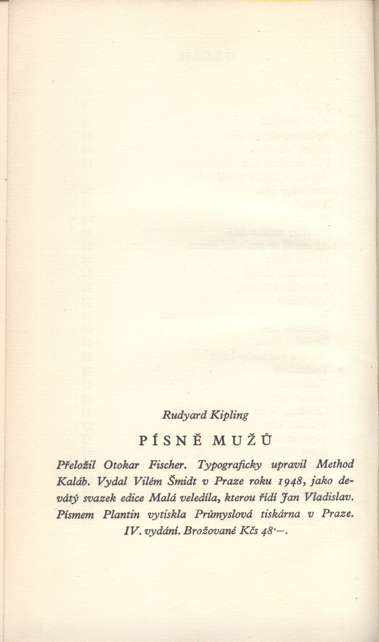 Title information Písně mužů / Rudyard Kipling ; přeložil Otokar Fischer Personal name Kipling, Rudyard, 1865-1936 (Author) Další autoři Fischer, Otokar, 1883-1938 (Translator) (Author of afterword, colophon, etc.) Kaláb, Method, 1885-1963 (Typographer) Corporation Vilém Šmidt (nakladatelství) (Publisher) Průmyslová tiskárna v Praze (Printer) Edition statement IV. vydání Publication Praha : V. Šmidt, 1948 Manufacture V Praze : Průmyslová tiskárna Scope 65 stran ; 18 cm ISBN (Vázáno) Edition Edice Malá veledíla ; devátý svazek