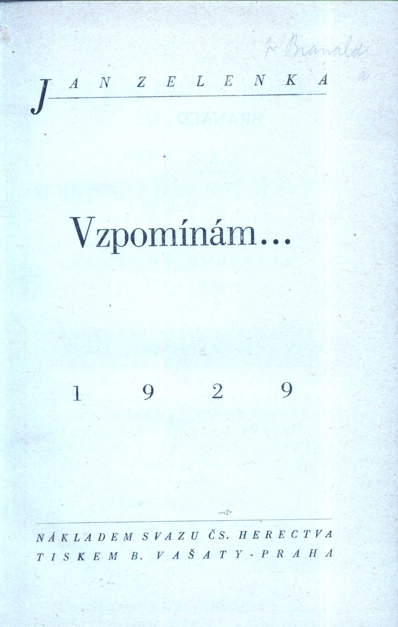 Title information Vzpomínám... / Jan Zelenka Personal name Zelenka, Jan, 1856-1931 (Author) Další autoři B. Vašata (knihtiskárna) (Printer) Publication Praha : nákladam Svazu českého herectva, 1929 Manufacture Praha : tiskem B. Vašaty Scope 178 stran ; 18 cm ISBN vázáno Country Czech Republic Language Czech Note Zdobená obálka. - Fotoportrét Jan Zelenky