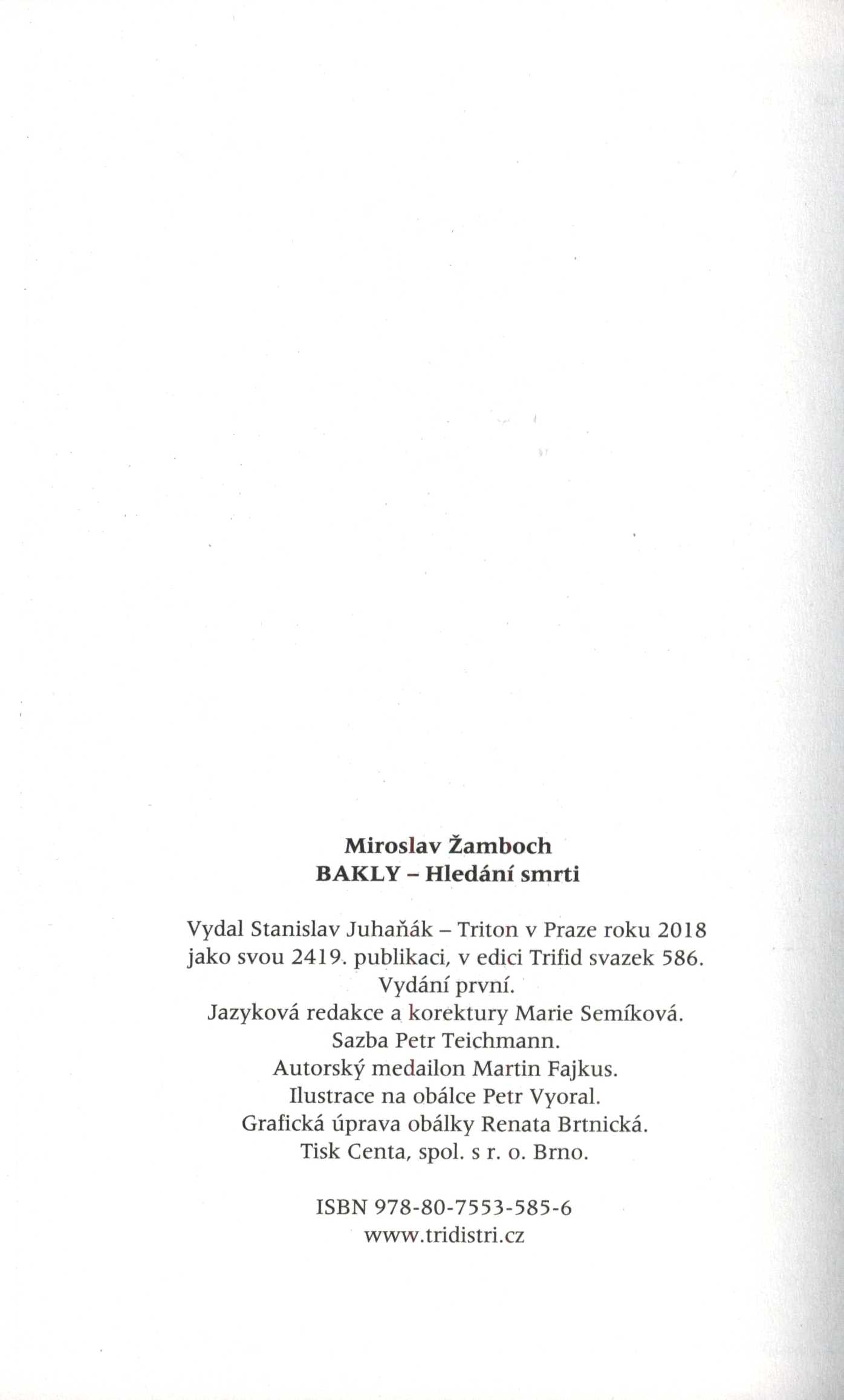 1. Title informationBakly - hledání smrti / Miroslav Žamboch ; autorský medailon Martin Fajkus ; ilustrace na obálce Petr Vyoral ; grafická úprava obálky Renata Brtnická