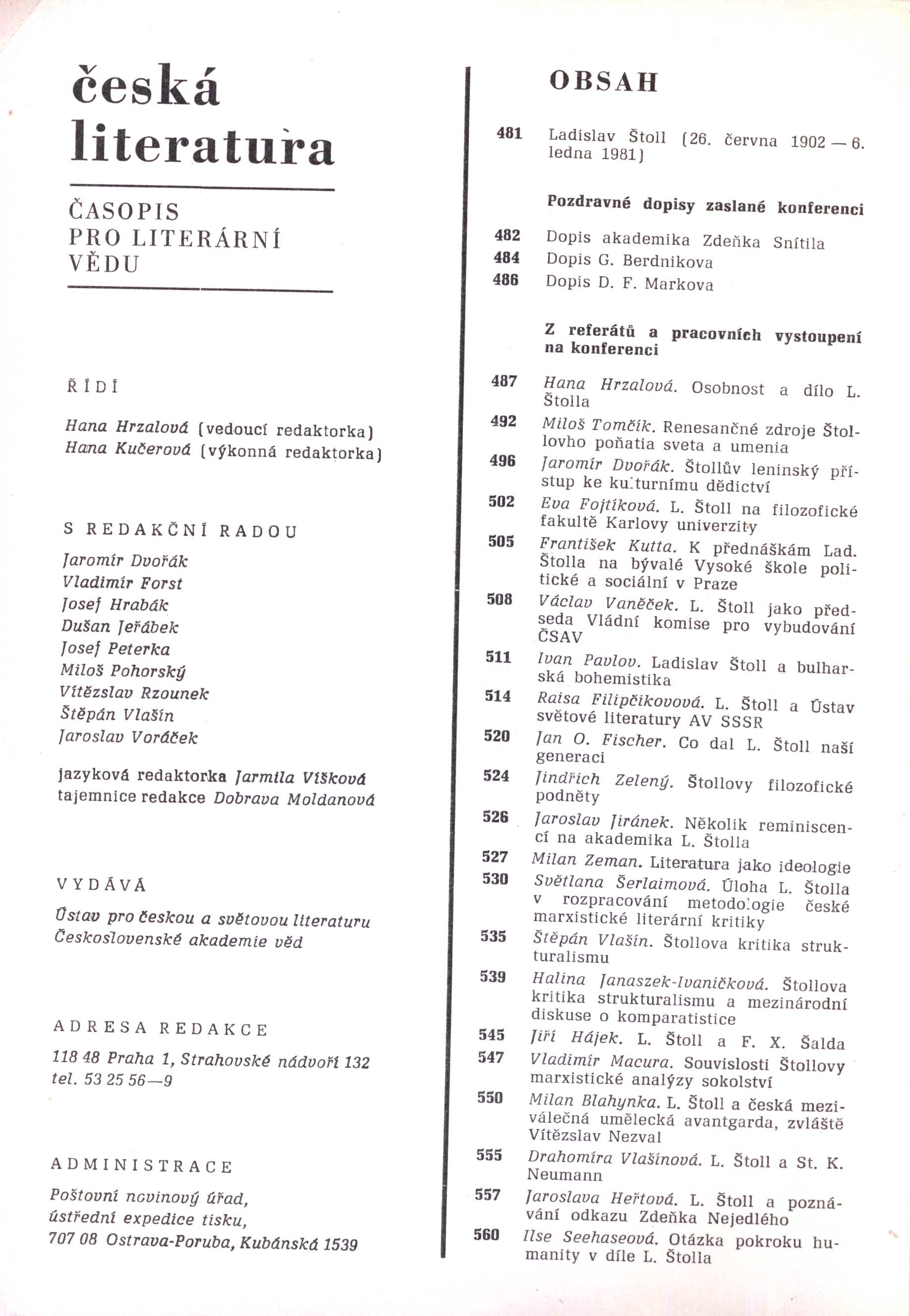 Title information Česká literatura : časopis pro literární vědu Další autoři Hrzalová, Hana, 1929-2019 (Publishing director) Corporation Ústav pro českou a světovou literaturu (Československá akademie věd) (Publisher) Roč., číslo Ročník 30, číslo 6, 1982 Publication Praha : Ústav pro českou a světovou literaturu ČSAV, 1982 Scope Strana 482-576 : portrét ; 25 cm Country Czech Republic Language Czech Note Číslo obsahuje referáty z mezinárodní vědecké konference na téma Osobnost a dílo akademika Ladislava Štolla, konané 18.-19. května v Praze