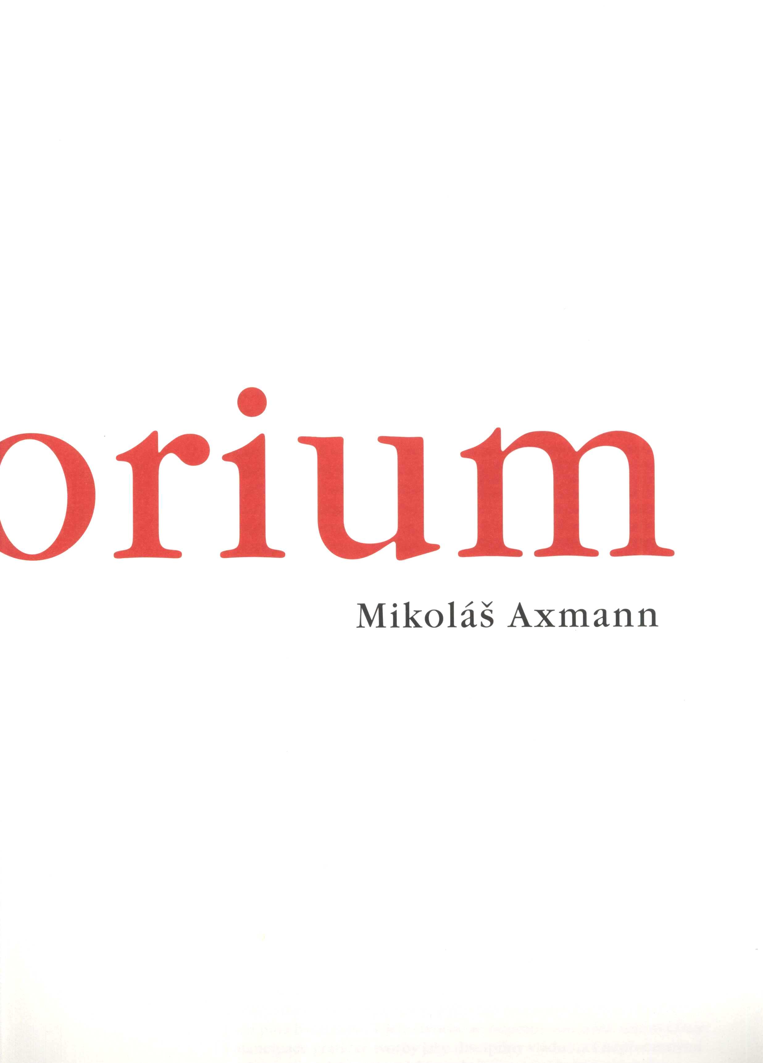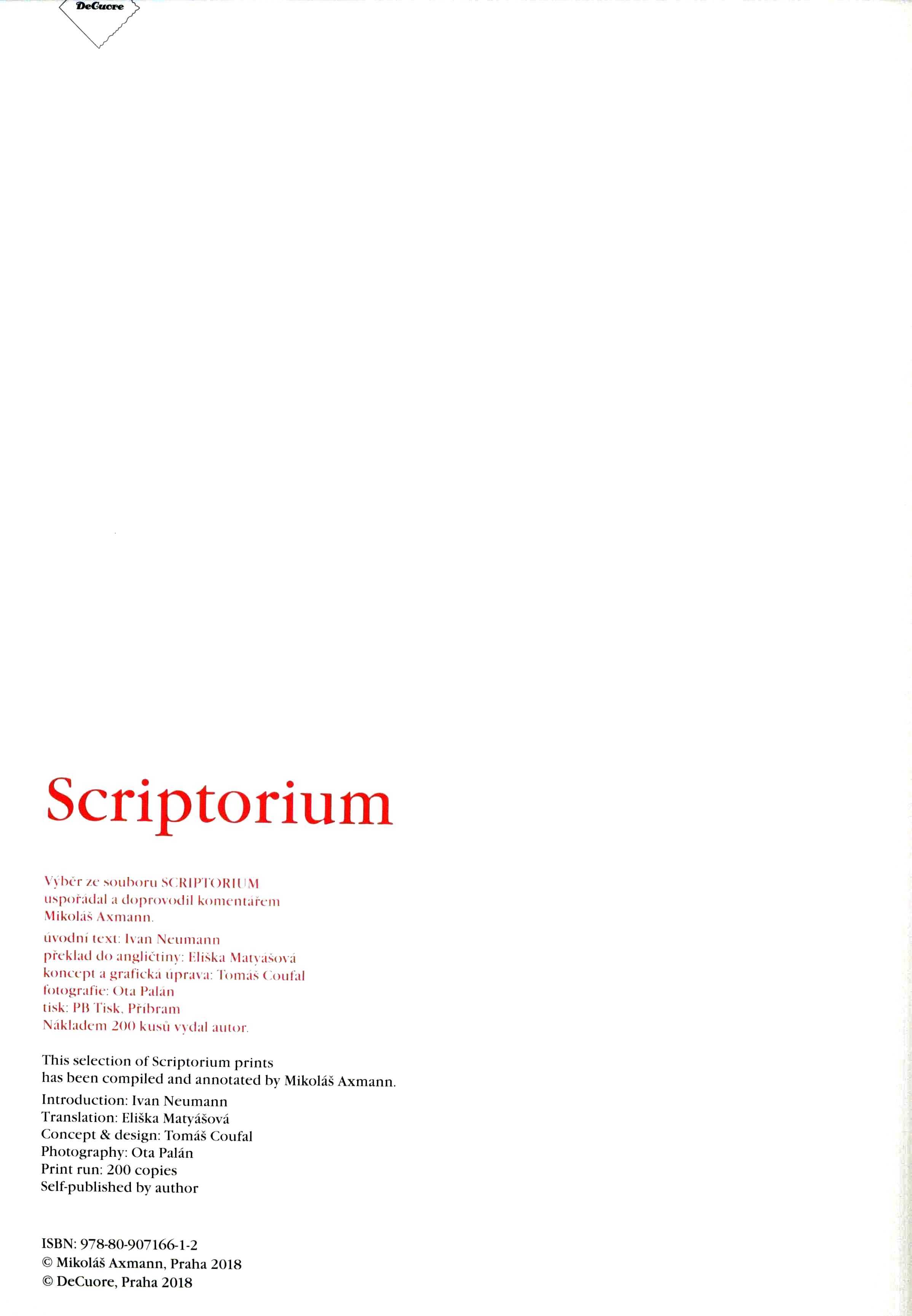 1. Title informationScriptorium / Mikoláš Axmann ; výběr ze souboru SCRIPTORIUM uspořádal a doprovodil komentářem Mikoláš Axmann ; úvodní text: Ivan Neumann ; překlad do angličtiny: Eliška Matyášová ; koncept a grafická úprava: Tomáš Coufal ; fotografie: Ota Palán