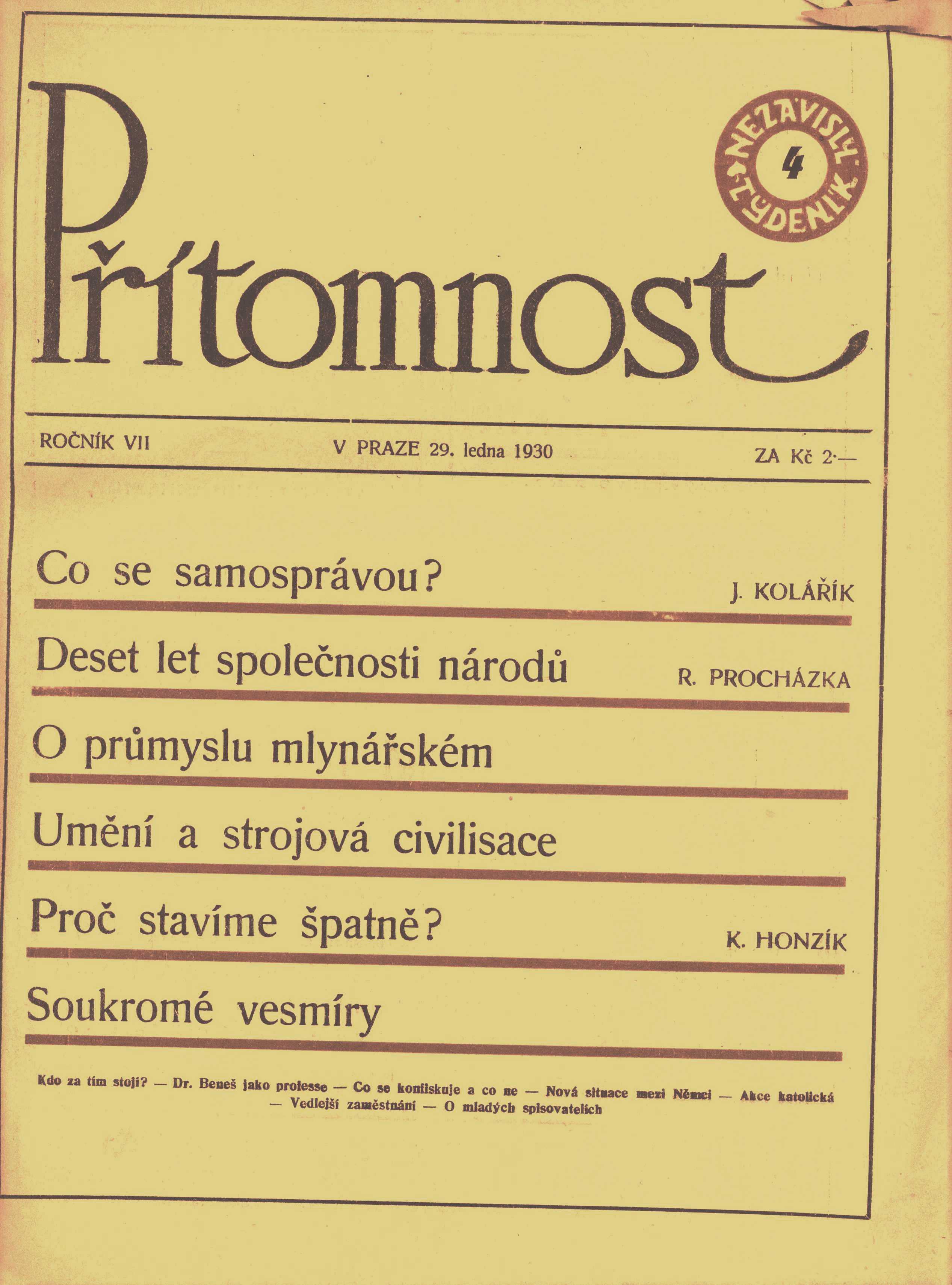 Title information Přítomnost : nezávislý týdeník Další autoři Peroutka, Ferdinand, 1895-1978 (Publishing director) Corporation Fr. Borový (firma) (Publisher) Edvard Leschinger (firma) (Printer) Roč., číslo Ročník 7, číslo 1-52, 1930 Publication V Praze : Fr. Borový, 1930 Manufacture Edvard Leschinger Scope 832 stran ; 31 cm ISSN 1805-2924 Country Czech Republic Language Czech Note 1-52 (9. ledna - 31. prosince 1930)