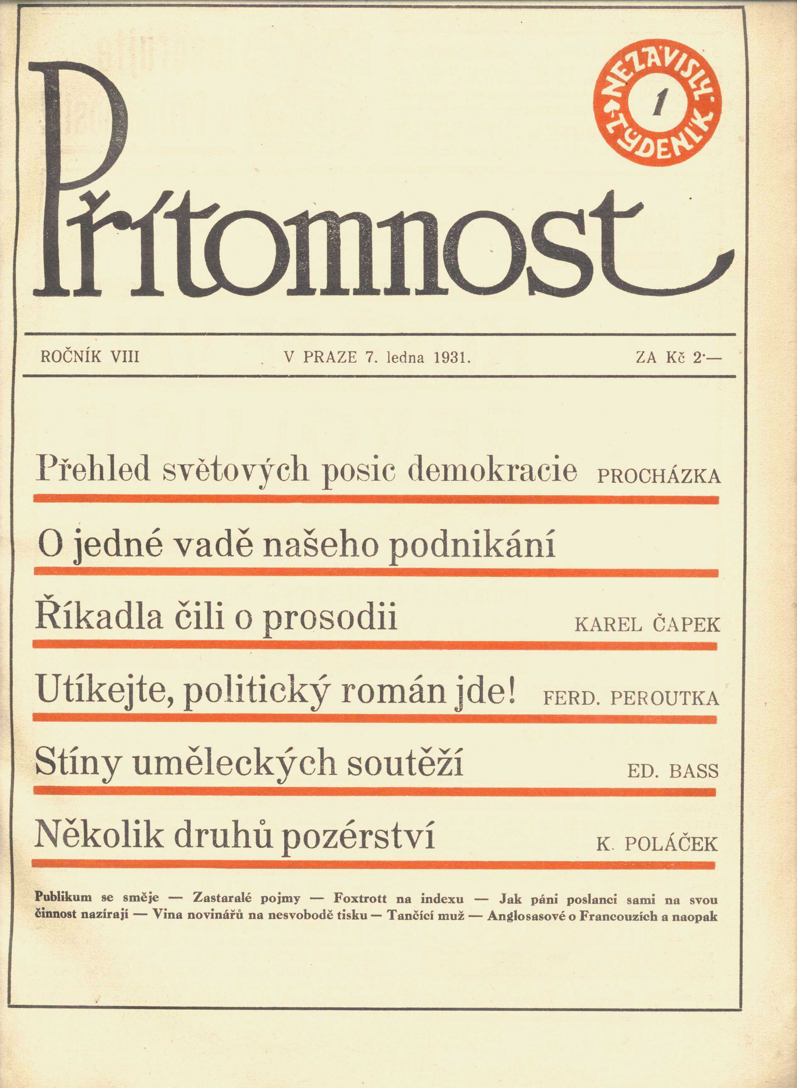 Title information Přítomnost : nezávislý týdeník Další autoři Peroutka, Ferdinand, 1895-1978 (Publishing director) Corporation Fr. Borový (firma) (Publisher) Česká grafická Unie (tiskárna a nakladatelství) (Printer) Roč., číslo Ročník 8, číslo 1-52, 1931 Publication V Praze : Fr. Borový, 1931 Manufacture Tiskem České grafické Unie a.s. Scope 832 stran : ilustrace ; 31 cm ISSN 1805-2924 Country Czech Republic Language Czech Note Čb. ilustrace