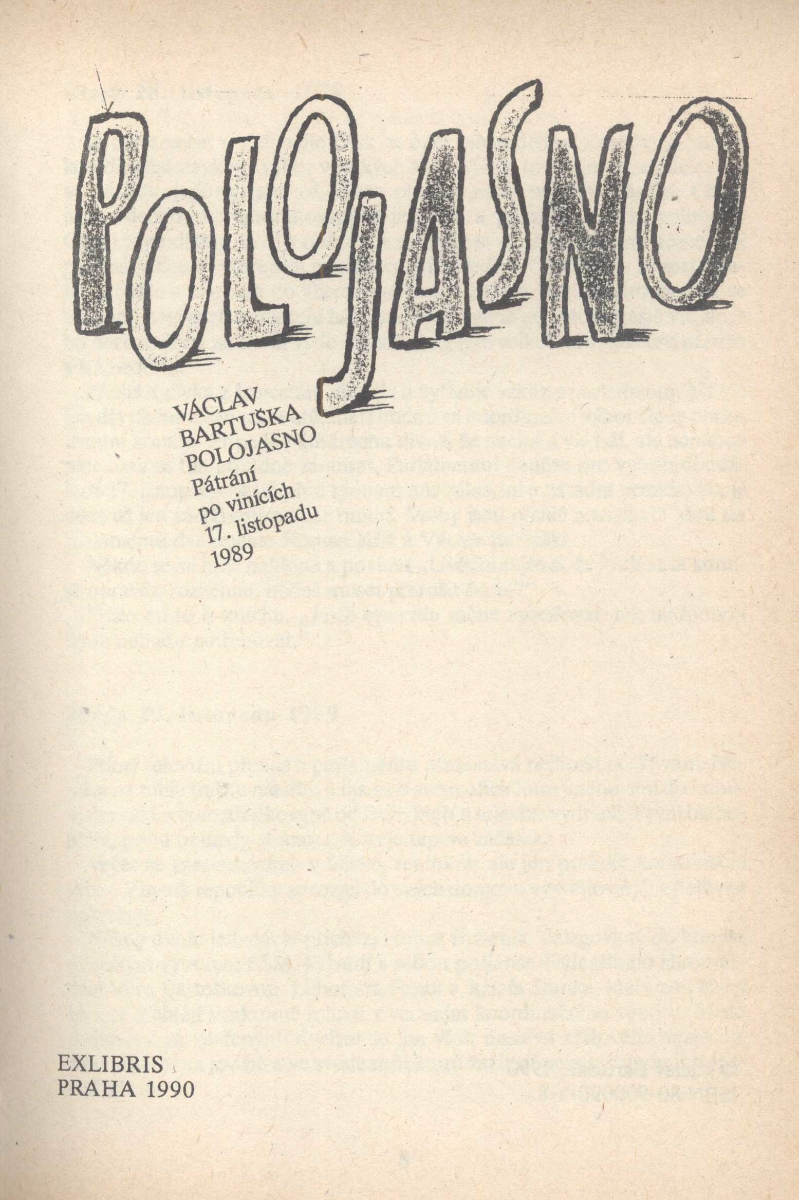 Title information Polojasno : pátrání po vinících 17. listopadu 1989 / Václav Bartuška Personal name Bartuška, Václav, 1968- (Author) Další autoři Nagaj, Vladimír, 1949- (Bookjacket designer) (Typographer) Corporation Ex libris (nakladatelství) (Publisher) Mír, novinářské závody (tiskárna) (Printer) Další var.názvy Pátrání po vinících 17. listopadu 1989 Edition statement Vydání druhé Publication Praha : Ex libris, 1990 Manufacture Praha : Mír Scope 251 stran ; 21 cm ISBN 80-900090-8-5 (v knize neuvedeno ; brožováno) Country Czech Republic Language Czech Note Obálku navrhl a typograficky upravil Vladimír Nagaj