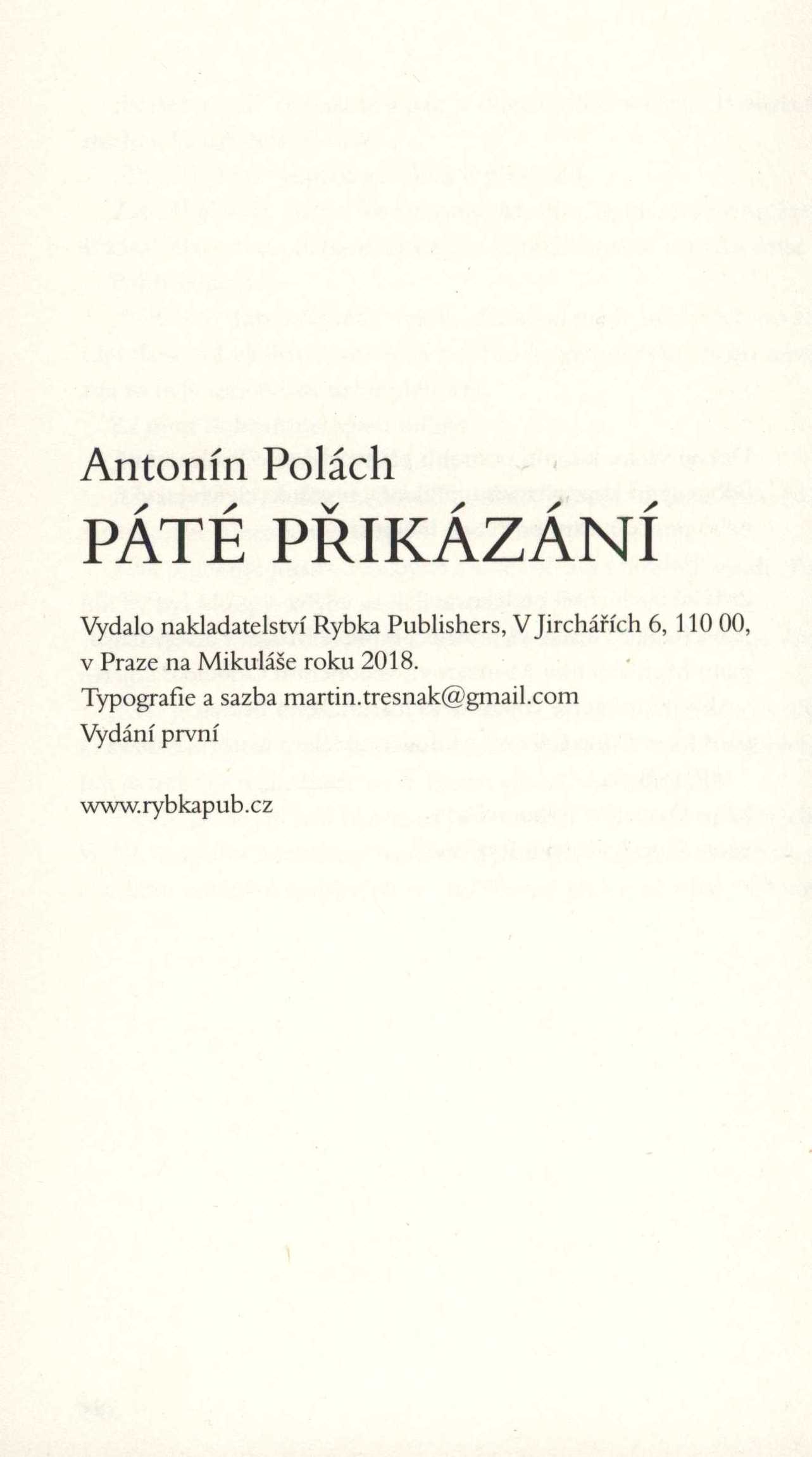 Title information Páté přikázání : příběh zakázané lásky z počátku třicetileté války / Antonín Polách Personal name Polách, Antonín, 1959- (Author) Další autoři Rybka Publishers (nakladatelství) (Publisher) Edition statement Vydání první Publication V Praze : Rybka Publishers, 2018 Scope 391 stran ; 22 cm ISBN 978-80-87950-54-8 (vázáno) Country Czech Republic Language Czech Note Barevná ilustrace na obálce. - Na záložkách obálky anotace a poznámka o autorovi.