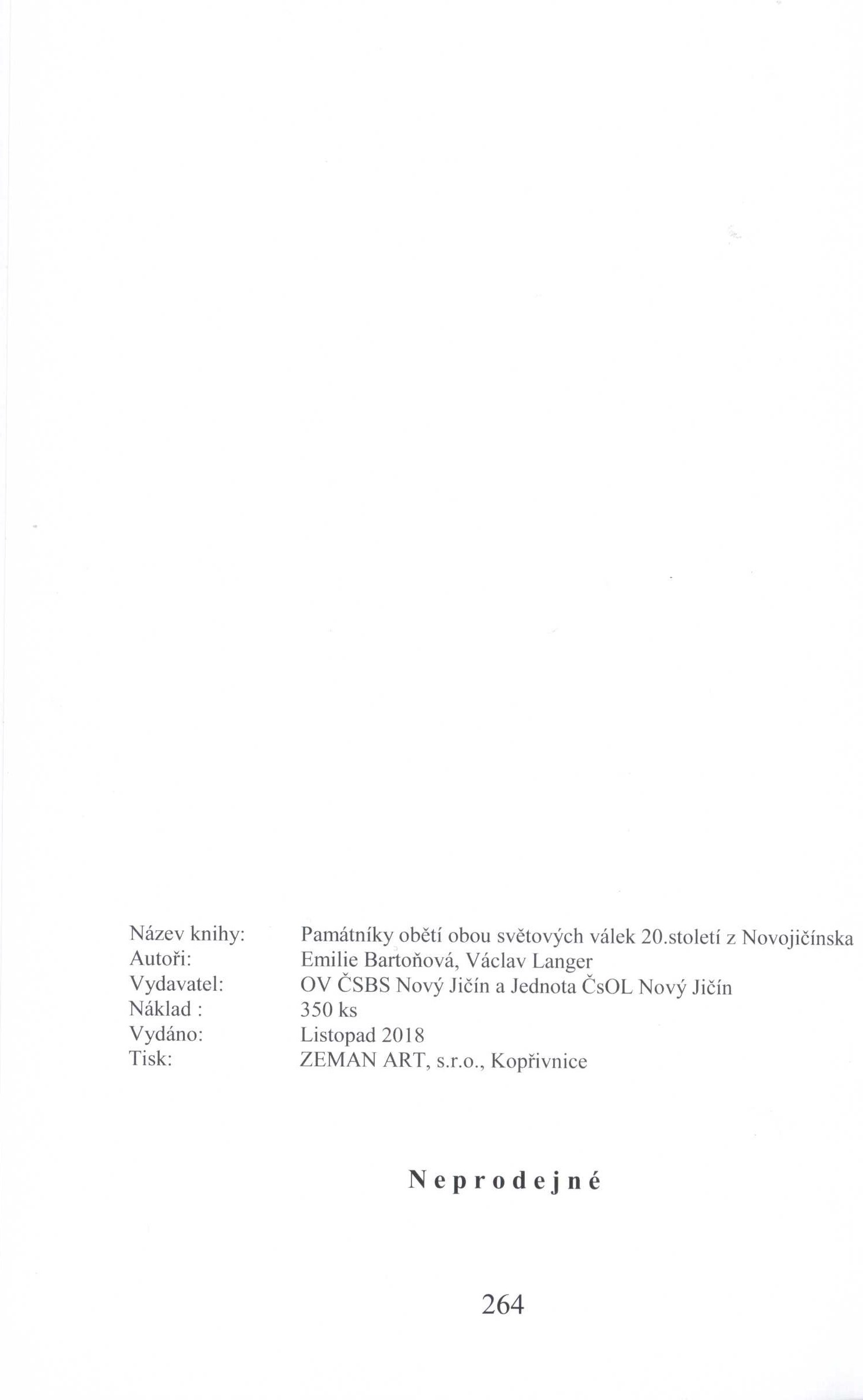Title information Památníky obětí obou světových válek 20. století z Novojičínska / Emilie Bartoňová, Václav Langer Personal name Bartoňová, Emilie (Author) Další autoři Langer, Václav, 1934- (Author) Corporation ZEMAN ART, s.r.o. (tiskárna) (Printer) Český svaz bojovníků za svobodu. Oblastní výbor Lidice (Publisher) Československá obec legionářská. Jednota Nový Jičín (Publisher) Publication Nový Jičín : Český svaz bojovníků za svobodu, Oblastní výbor Nový Jičín : Československá obec legionářská, Jednota Nový Jičín, 2018 Manufacture Kopřivnice : ZEMAN ART, s.r.o. Scope 264 stran : barevné ilustrace ; 22 cm ISBN 978-80-270-5796-2 (v knize neuvedeno ; vázáno) : neprodejné Country Czech Republic Language Czech Note Modrá vazba s barevnou fotografií, černý text. - Přispěvatelé vydání knihy. - Úvod autorů. - Obsah. - Pamětní místa (barevná fotografie, popis, poznámky). - Doslov. - Na zadní straně vazby barevné znaky OV ČSBS Nový Jičín a Jednoty ČsOL Nový Jičín.