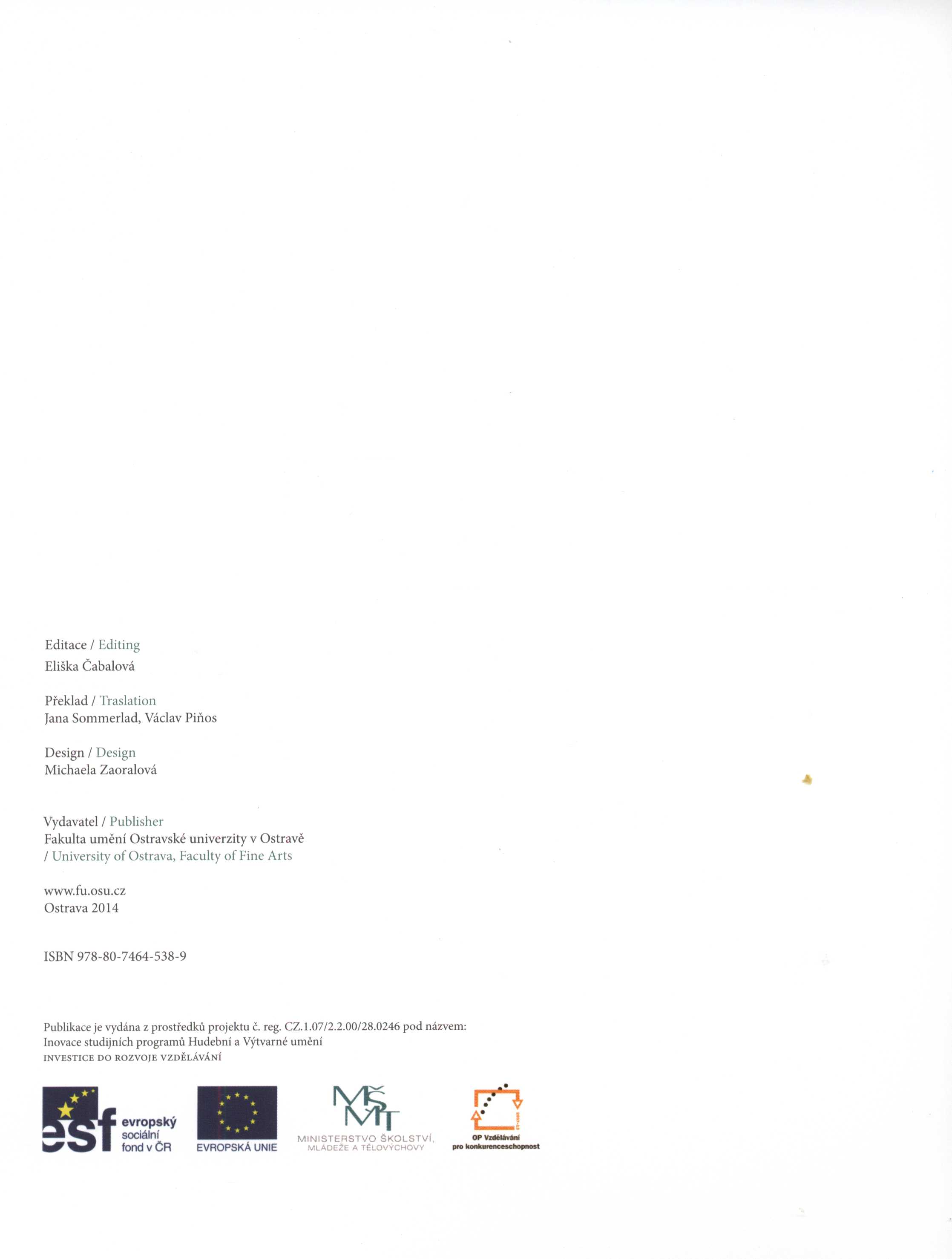 Title information "Kámen, nůžky, papír" = "Stone, scissors, paper" / editace Eliška Čabalová ; design Michaela Zaoralová Další autoři Čabalová, Eliška, 1955- (Editor) Zaoralová, Michaela (Book designer) Corporation Ostravská univerzita. Fakulta umění (Publisher) Publication Ostrava : Fakulta umění Ostravské univerzity v Ostravě, 2014 Scope 189 stran : ilustrace (převážně barevné) ; 26 cm ISBN 978-80-7464-538-9 (brožováno) Country Czech Republic Language Czech * English Language of the original Czech Note Typografická obálka. - Převážně barevné fotografie. - Přehled soutěží, výstav a absolventů. - Souběžný anglický text.