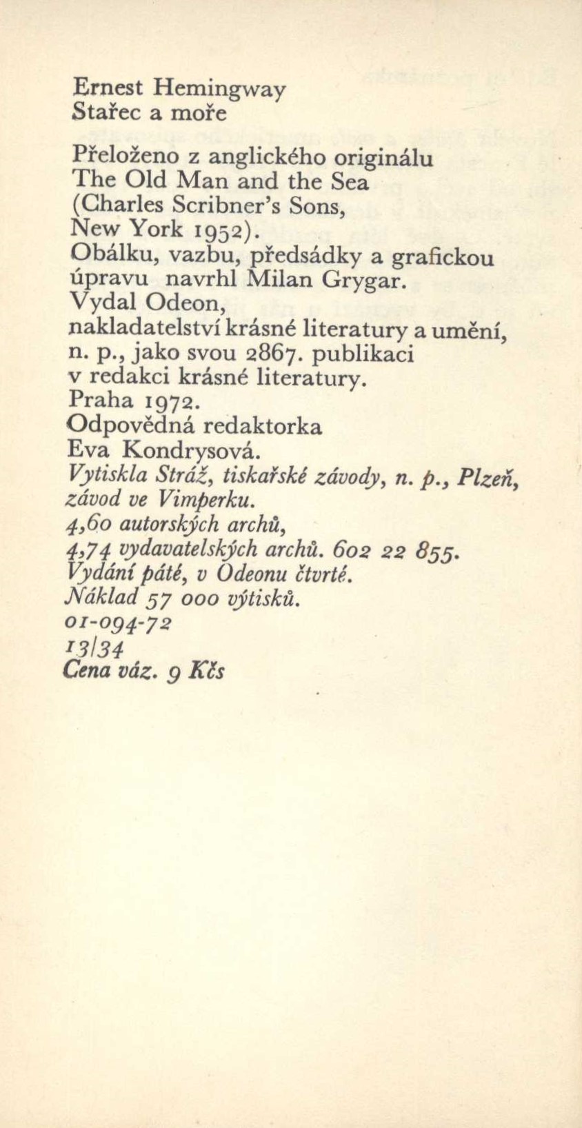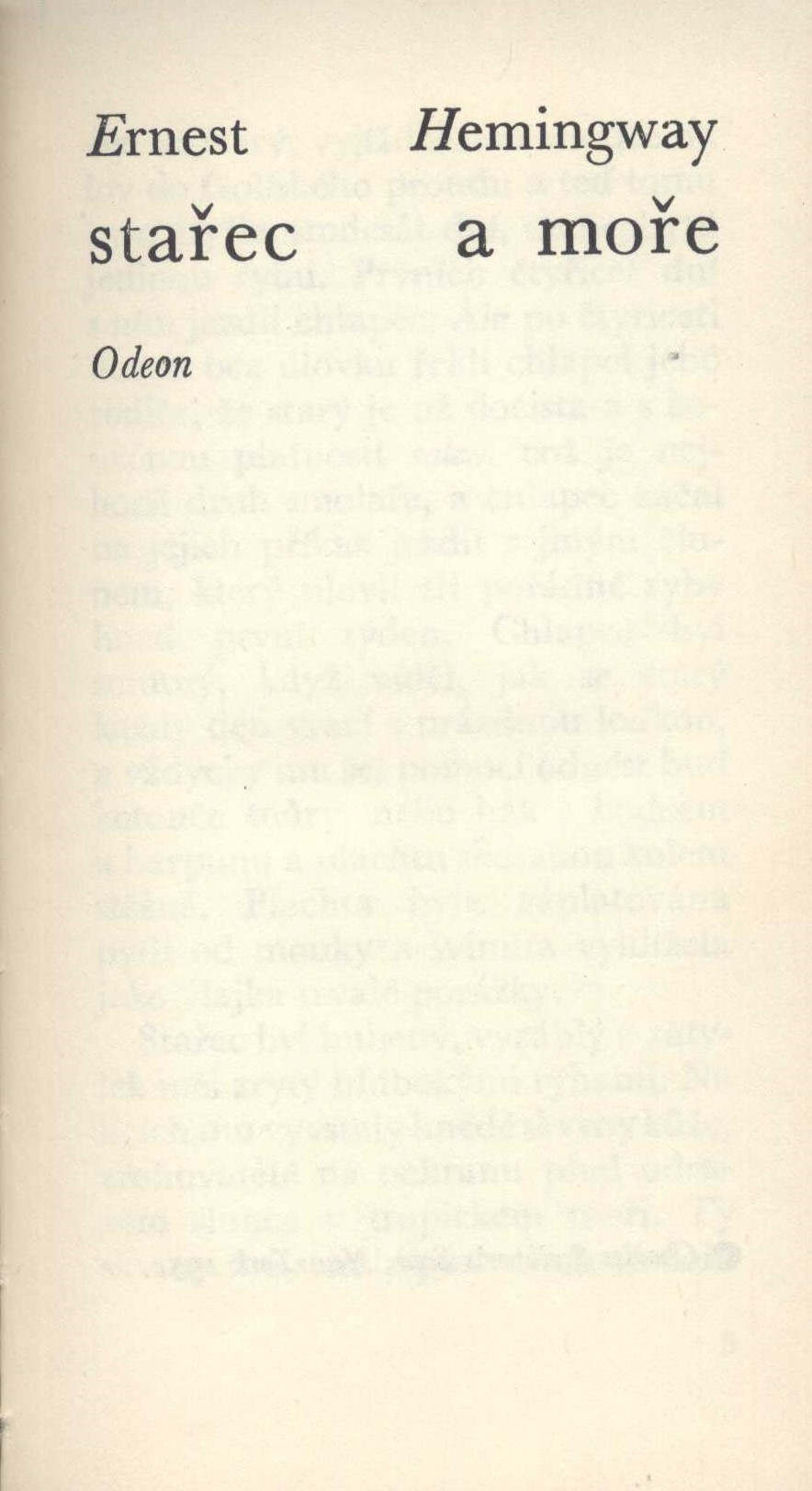 Názvové údaje Stařec a moře / Ernest Hemingway Osobní jméno Hemingway, Ernest, 1899-1961 (Autor) Unifikovaný název Old man and the sea. Česky Další autoři Odeon (nakladatelství) (Nakladatel, vydavatel) Stráž, tiskařské závody (Tiskař) Údaje o vydání Vydání páté, v Odeonu čtvrté Nakladatel Praha : Odeon, 1972 Výrobce Ve Vimperku : Stráž, tiskařské závody, n. p., Plzeň Rozsah 152 stran ; 15 cm ISBN (Vázáno) Země vyd. Česko Jazyk dok. čeština Jazyk orig. angličtina Poznámky Přeloženo z anglického originálu The Old Man and the Sea