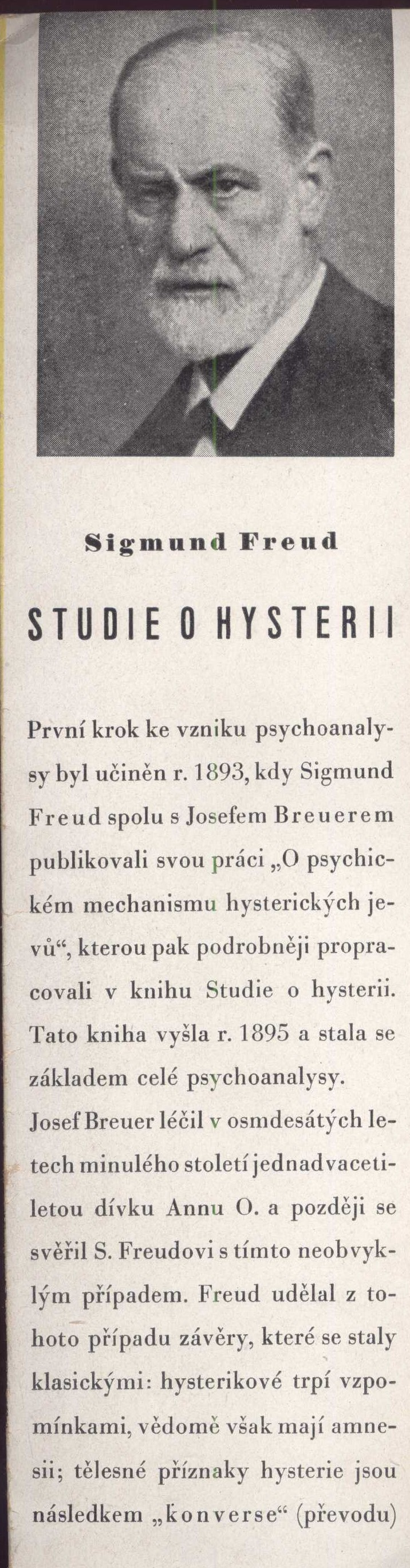 Document kind monografie Translation of Studien über Hysterie. Keywords německy psaná literatura * studie * hysterie * psychoanalýza * Freud S. * český překlad * r. 1947 UDC 821=112.2 * =030 * 159.9 * 616.891.2 * 159.964 Uživatelské pole PNP Knihovna V. Zinkové. U sign. VZinková 0756 (brožovaný výtisk) barevná typografická obálka. - Na přední záložce foto autora, upoutávka na knihu, pokračuje na zadní záložce. - Patitul. - Titulní list. - Na rubu titulního listu poznámka. - Předmluvy k 1. a 2. vydání. - Neživá a živá záhlaví. - Poznámky dole na stránce. - Doslov redakce. - Obsah. - Tiráž. - Na zadní straně obálky nakladatelská značka. U sign. VZinková 0756 obálka mírně zašpiněná, na hřbetu místy narušená, volně vložené volné složky; listy zažloutlé s nerovnými kraji a mírně ohnutými rožky. Rozsah: 187, [5] s. Rozměr: 23,5 cm. Originál Studien über Hysterie vyšel poprvé v roce 1895. Call number Track No. Location Info VZinková 0756 2014/2019 Sbírka