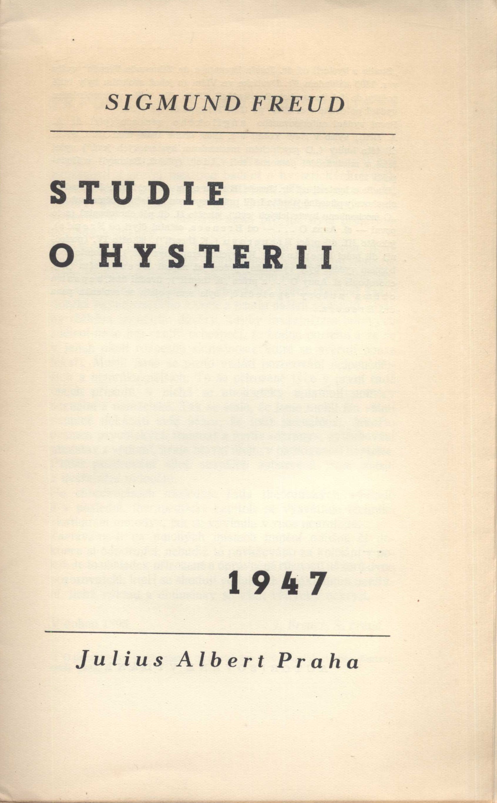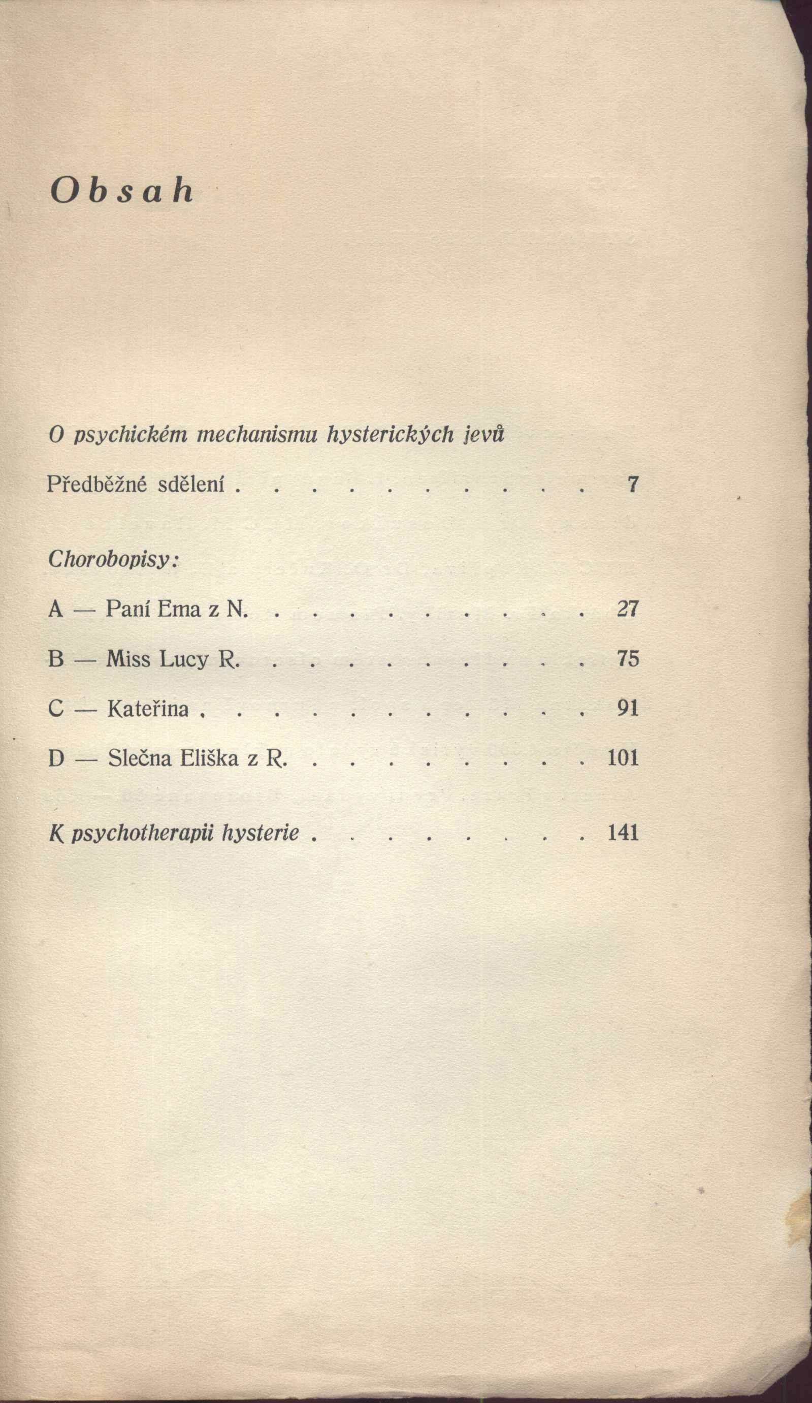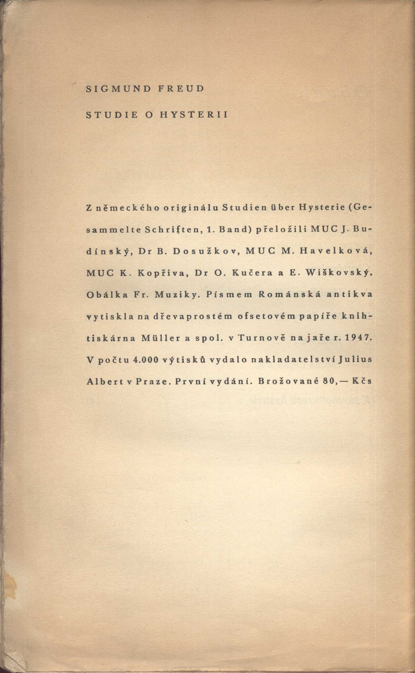 Title information Studie o hysterii / Sigmund Freud ; z německého originálu Studien über Hysterie přeložili J. Budínský, B. Dosužkov, M. Havelková, K. Kopřiva, O. Kučera a E. Wiškovský Personal name Freud, Sigmund, 1856-1939 (Author) Další autoři Budínský, J. (Translator) Dosužkov, Fedor Nikolajevič, 1899-1982 (Translator) (Author of afterword, colophon, etc.) Havelková, M. (Translator) Kopřiva, K. (Translator) Kučera, Otakar, 1906-1980 (Translator) Wiškovský, Eugen, 1888-1964 (Translator) Muzika, František, 1900-1974 (Bookjacket designer) Corporation Julius Albert (nakladatelství) (Publisher) Müller a spol. (tiskárna) (Printer) Edition statement První vydání Publication Praha : Julius Albert, 1947 Manufacture V Turnově : knihtiskárna Müller a spol. Scope 187 stran ; 24 cm ISBN (Brožováno) Country Czech Republic Language Czech Language of the original German Note Obálka F. Muziky