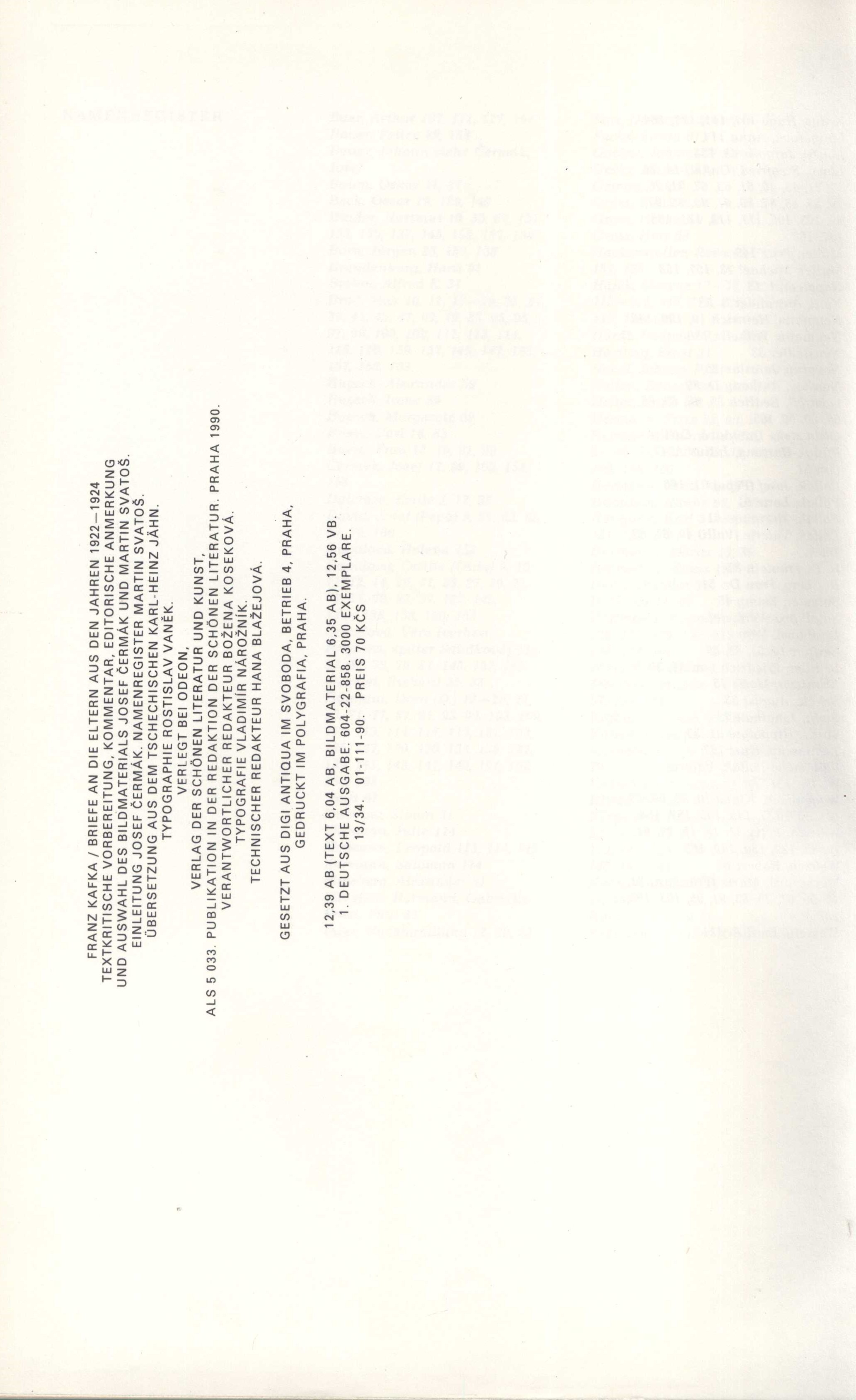 Title information Briefe an die Eltern aus den Jahren 1922-1924 / Franz Kafka ; herausgegeben von Josef Čermák und Martin Svatoš Personal name Kafka, Franz, 1883-1924 (Author) Další autoři Svatoš, Martin, 1951- (Compiler) (Commentator) Čermák, Josef, 1928-2020 (Compiler) Jähn, Karl-Heinz, 1932- (Translator) Vaněk, Rostislav, 1945- (Typographer) Corporation Odeon (nakladatelství) (Publisher) Polygrafia (tiskárna, Praha) (Printer) Edition statement 1. deutsche Ausgabe Publication Praha : Odeon, 1990 Manufacture Praha : Polygrafia Scope 164 stran : faksimile, fotografie, portréty ; 30 cm ISBN 80-207-0220-2 (vázáno) Country Czech Republic Language German Language of the original Czech Note Textkritische Vorbereitung, Kommentar, editorische Anmerkung und Auswahl des Bildmaterials Josef Čermák und Martin Svatoš