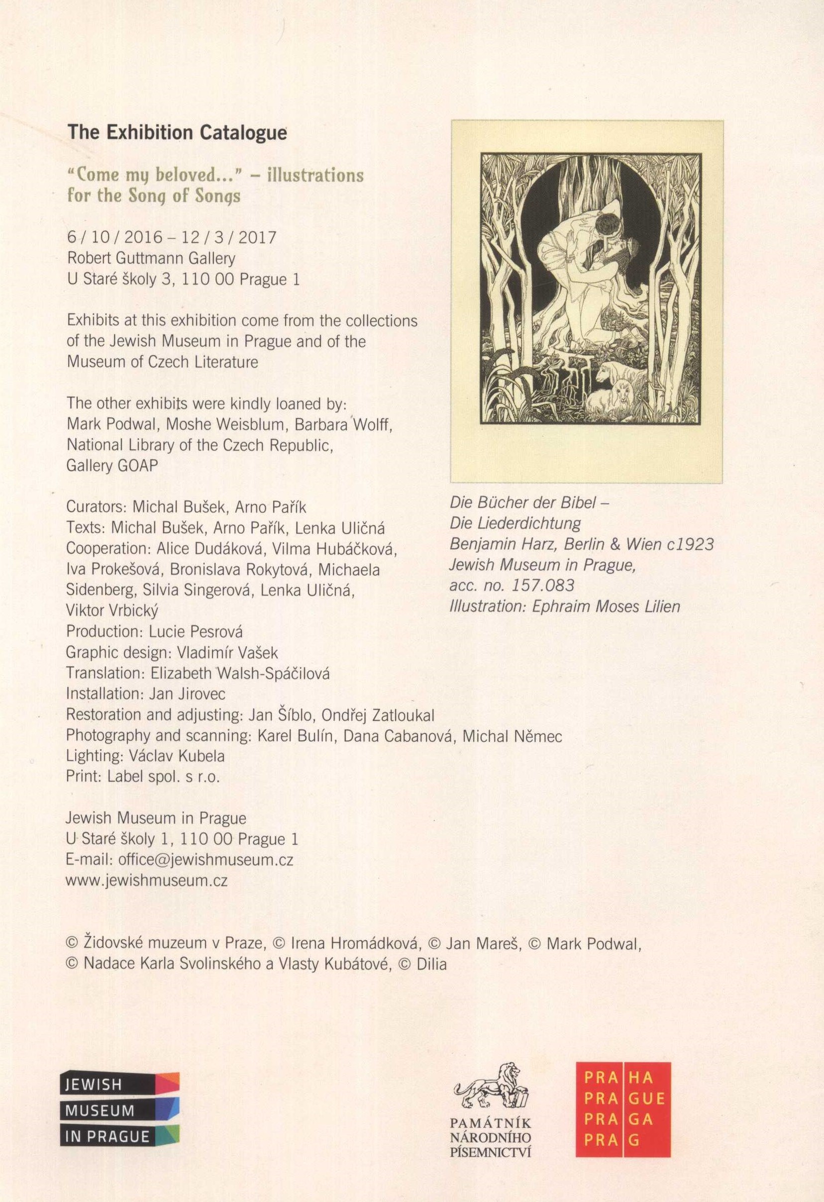 Title information "Come my beloved..." : Illustrations for the Song of Songs : 6th October 2016 - 12th March 2017, Robert Guttmann Gallery, U Staré školy 3, Prague 1 / texts: Michal Bušek, Arno Pařík, Lenka Uličná ; graphic design: Vladimír Vašek ; translation: Elizabeth Walsh-Spáčilová Personal name Bušek, Michal, 1975- (Author) (Curator) Další autoři Pařík, Arno, 1948- (Author) (Curator) Uličná, Lenka, 1979- (Author) Walsh-Spáčilová, Elizabeth, 1970- (Translator) Vašek, Vladimír, 1974- (Book designer) Corporation Židovské muzeum (Praha, Česko) (Publisher) (Organizer of meeting) Label spol. s r.o. (tiskárna) (Printer) Galerie Roberta Guttmanna (Praha, Česko) (Organizer of meeting) (Other) Památník národního písemnictví (muzeum literatury) (Other) Publication Prague : Jewish Museum, [2016] Manufacture [Kutná Hora] : Label spol. s r.o. Scope 11 stran : ilustrace ; 21 cm ISBN (Brožováno) Country Czech Republic Language English Language of the original Czech Note Název z obálky. - Barevná ilustrace na obálce, vícebarevný text. - Černobílé, tónované a barevné reprodukce s popisky. - Na zadní straně obálky údaje tiráže, drobná tónovaná reprodukce a loga institucí.