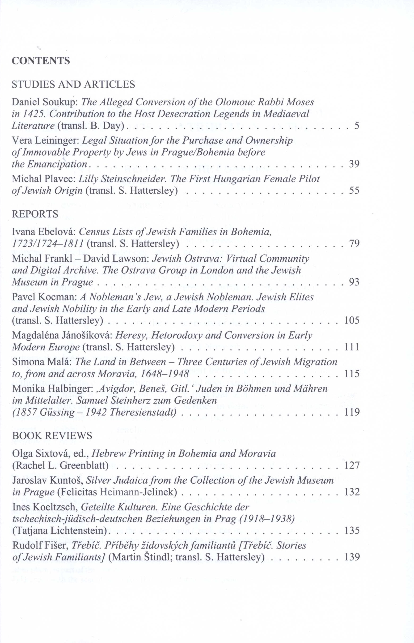 Title information Judaica Bohemiae Další autoři Cermanová, Iveta, 1976- (Editor) Putík, Alexandr, 1950- (Editor) Vašek, Vladimír, 1974- (Graphic technician) Hattersley, Stephen (Translator) Day, Barbara, 1944- (Translator) Corporation Židovské muzeum (Praha, Česko) (Publisher) Carter Reproplus s.r.o. (tiskárna) (Printer) Roč., číslo 48/1, 2013 Publication Praha : Židovské muzeum v Praze, 2013 Manufacture Carter\Reproplus s.r.o. Scope 141 stran : fotografie, portréty, faksimile ; 24 cm ISBN (Brožováno) ISSN 0022-5738 Country Czech Republic Language English * German Note Text anglicky a německy. - Čb. fotografie, portréty a faksimile.