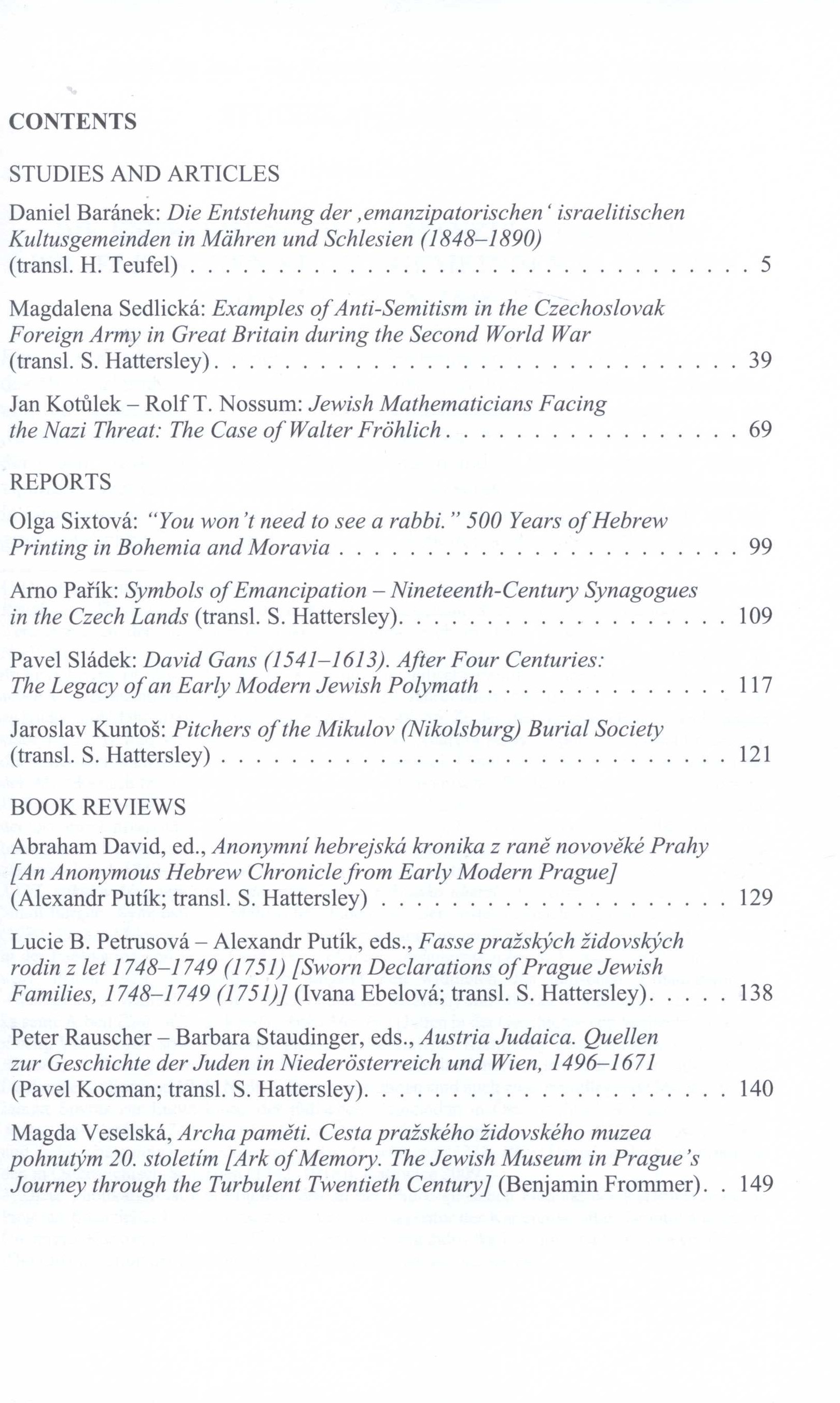 Title information Judaica Bohemiae Další autoři Cermanová, Iveta, 1976- (Editor) Putík, Alexandr, 1950- (Editor) Vašek, Vladimír, 1974- (Graphic technician) Hattersley, Stephen (Translator) Teufel, Helmut, 1944- (Translator) Corporation Židovské muzeum (Praha, Česko) (Publisher) Carter\reproplus s.r.o. (tiskárna, vydavatelství) (Printer) Roč., číslo 48/2, 2013 Publication Praha : Židovské muzeum v Praze, 2013 Manufacture Carter\Reproplus s.r.o. Scope 152 stran : fotografie, portréty, faksimile ; 24 cm ISBN (Brožováno) ISSN 0022-5738 Country Czech Republic Language English * German Note Text anglicky a německy. - Čb. fotografie, portréty a faksimile.