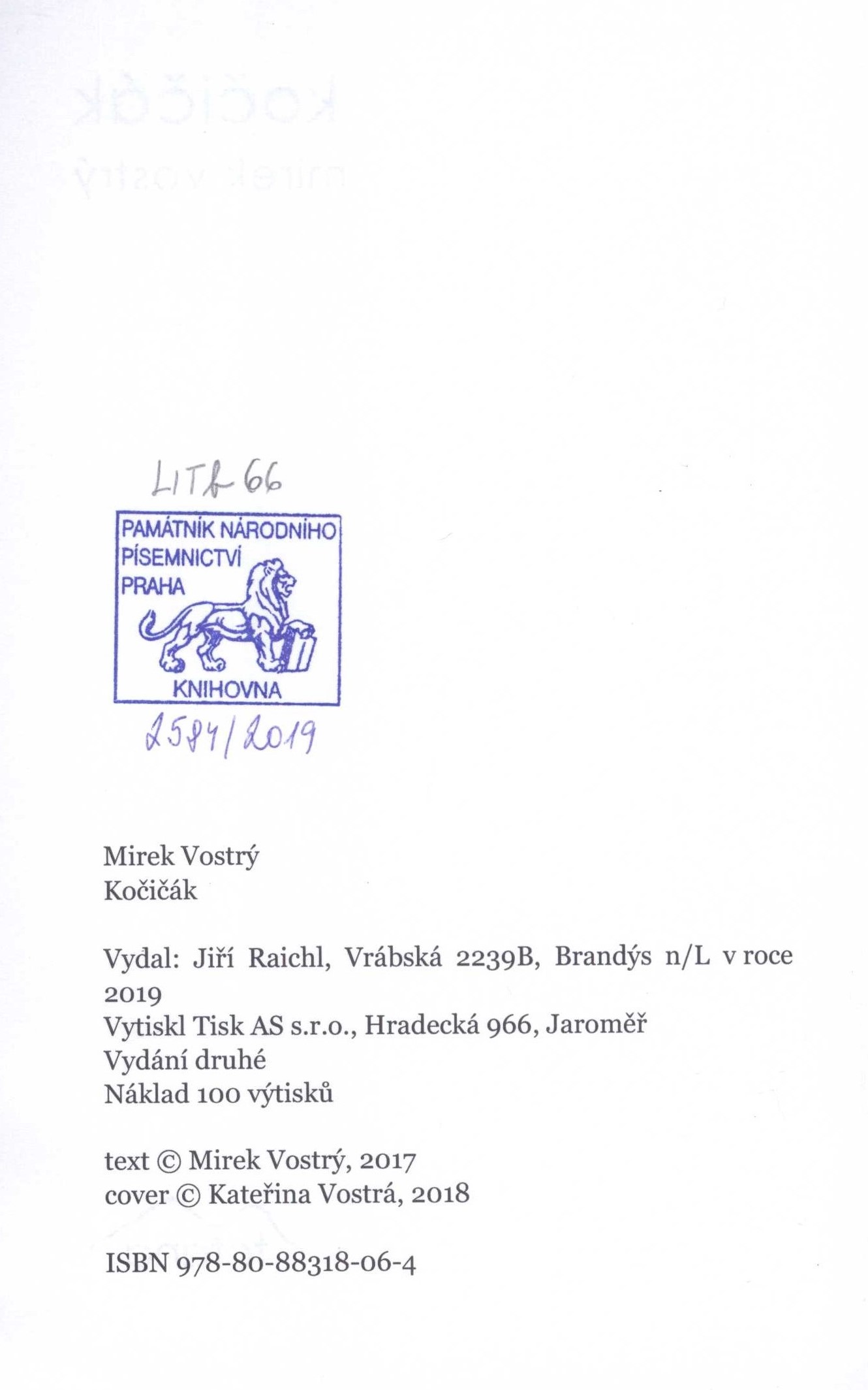 Title information Kočičák / Mirek Vostrý ; obálka Kateřina Vostrá Personal name Vostrý, Mirek, 1968- (Author) Další autoři Vostrá, Kateřina (Bookjacket designer) Corporation TOFANA (nakladatelství) (Publisher) Tisk AS, s.r.o. (tiskárna) (Printer) Edition statement Vydání druhé Publication Brandýs n/L. : Tofana, 2019 Manufacture Jaroměř : Tisk AS s.r.o. Scope 151 stran ; 19 cm ISBN 978-80-88318-06-4 (brožováno) Country Czech Republic Language Czech Note Světlá obálka s barevnou ilustrací, dvoubarevný text (i na hřbetu). - Nakladatelská značka na titulním listu. - Údaje tiráže na rubu titulního listu. - Obsah. - Upoutávky na daší knihy z nakladatelství. - Drobné černobílé foto autora a jeho stručná biografie, anotace knihy a nakladatelská značka na zadní straně obálky.