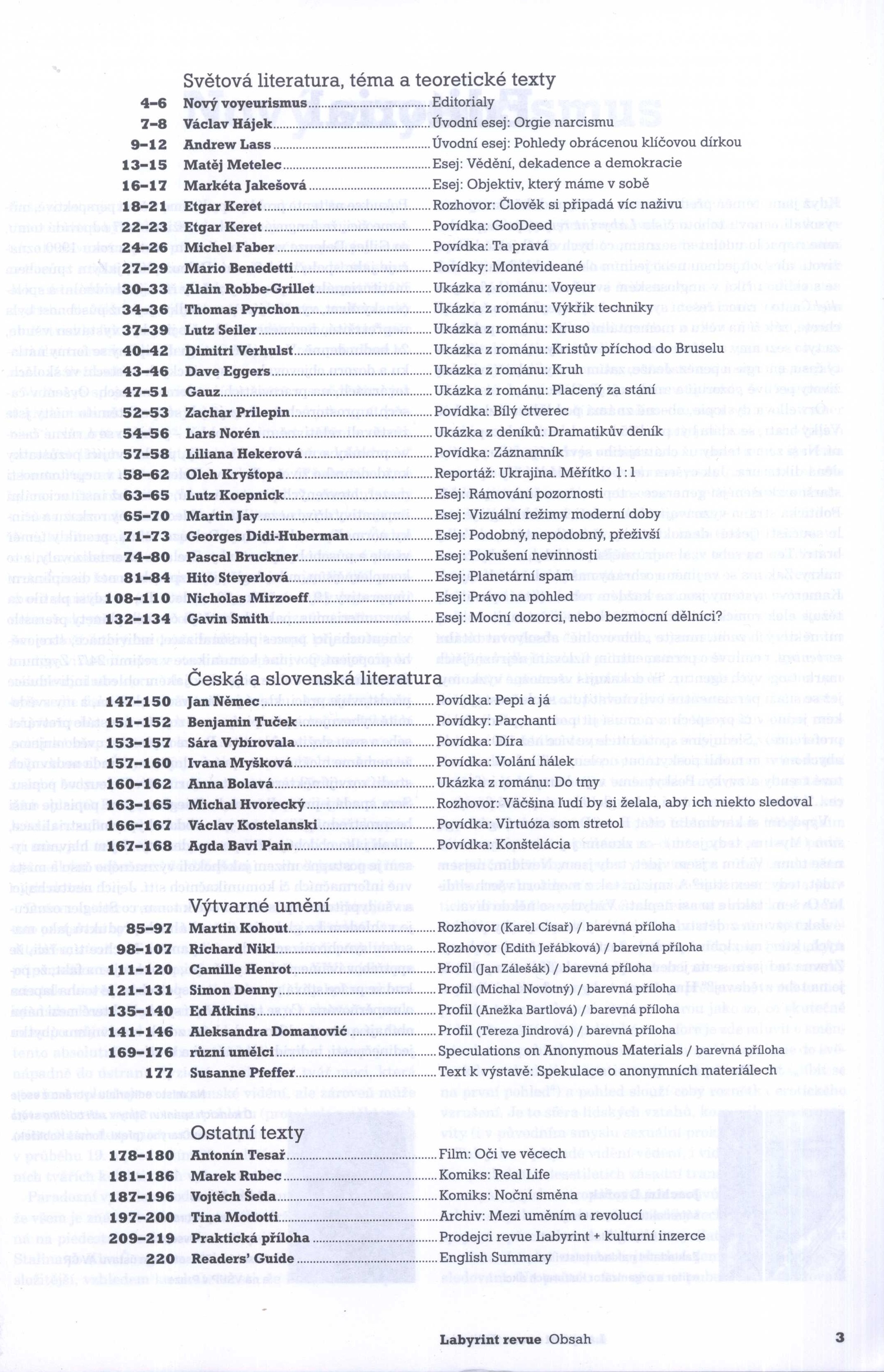 Title information Labyrint revue : časopis pro kulturu. Nový voyeurismus Další autoři Dvořák, Joachim, 1966- (Publishing director) (Graphic technician) Meluš, Boris, 1981- (Graphic technician) Corporation Labyrint (nakladatelství) (Publisher) Roč., číslo Číslo 35-36, 2014 Publication Praha : Labyrint - Via Vestra, 2014 Manufacture Czech Promotion Print Scope 220 stran : ilustrace, fotografie, portréty ; 29 cm ISSN 1210-6887 Country Czech Republic Language Czech Note Černobílé a barevné ilustrace, fotografie a portréty