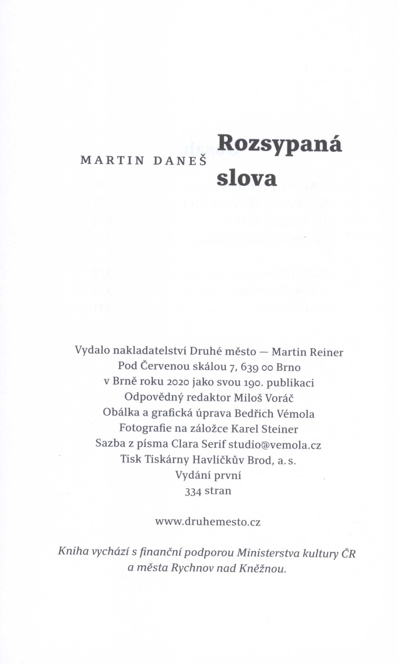 Názvové údaje Rozsypaná slova / Martin Daneš ; obálka a grafická úprava Bedřich Vémola Osobní jméno Daneš, Martin, 1962- (Autor) (Autor doslovu, tiráže atd.) Další autoři Vémola, Bedřich, 1970- (Autor obálky) (Knižní grafik) Korp. Druhé město (nakladatelství) (Nakladatel, vydavatel) Tiskárny Havlíčkův Brod (firma) (Tiskař) Údaje o vydání Vydání první Nakladatel Brno : Druhé město, 2020 Výrobce Havlíčkův Brod : Tiskárny Havlíčkův Brod, a.s. Rozsah 331 stran ; 20 cm ISBN 978-80-7227-433-8 (vázáno) Země vyd. Česko Jazyk dok. čeština Poznámky Barevná, graficky zdobená, obálka s bílým textem (i na hřbetu). - Černá, graficky zdobená, vazba s bílým textem (i na hřbetu). - Barevné předsádky. - Barevný, graficky zdobený list. - Nakladatelská značka na černém vakátě. - Patitul (černý list, bílý text). - Černý titulní list s bílým textem. - Věnování. - Motto. - Úvod kapitol (černé zdobené listy s bílým textem). - Poznámka. - Autorský doslov. - Poděkování. - Obsah. - Na zadní záložce černobílé foto autora a jeho stručná biografie. - Anotace knihy od L. Horňákové-Civade na zadní straně obálky. - Nakladatelská páska s bílým textem. - Přebal.