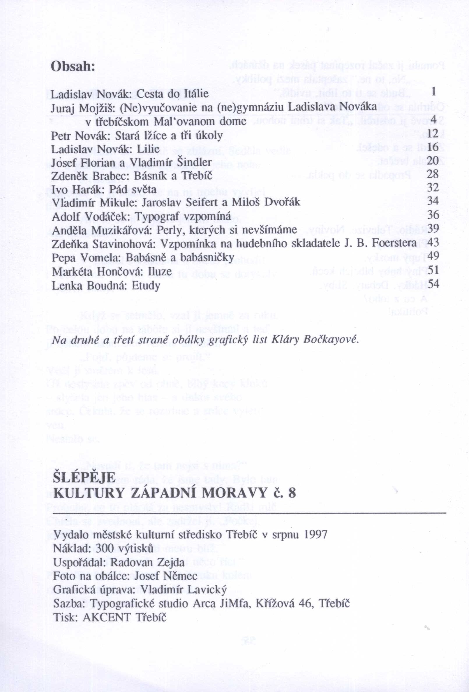 Title information Šlépěje kultury západní Moravy / uspořádal Radovan Zejda ; foto na obálce Josef Němec ; grafická úprava Vladimír Lavický Další autoři Zejda, Radovan, 1946-2021 (Compiler) Němec, Josef (Photographer) Lavický, Vladimír, 1923-1997 (Book designer) Roč., číslo Číslo 8, 1997 Publication Třebíč : Městské kulturní středisko, 1997 Manufacture AKCENT Scope 55 stran : fotografie, portréty, ilustrace, faksimile ; 20,5 cm ISBN (Brožováno) Country Czech Republic Language Czech * Slovak Note Název z obálky. - Na obálce: Literární klub Třebíč. - Text částečně slovensky. - Čb. fotografie, portréty, ilustrace a faksimile. - Vydáno v srpnu 1997. - 300 výtisků