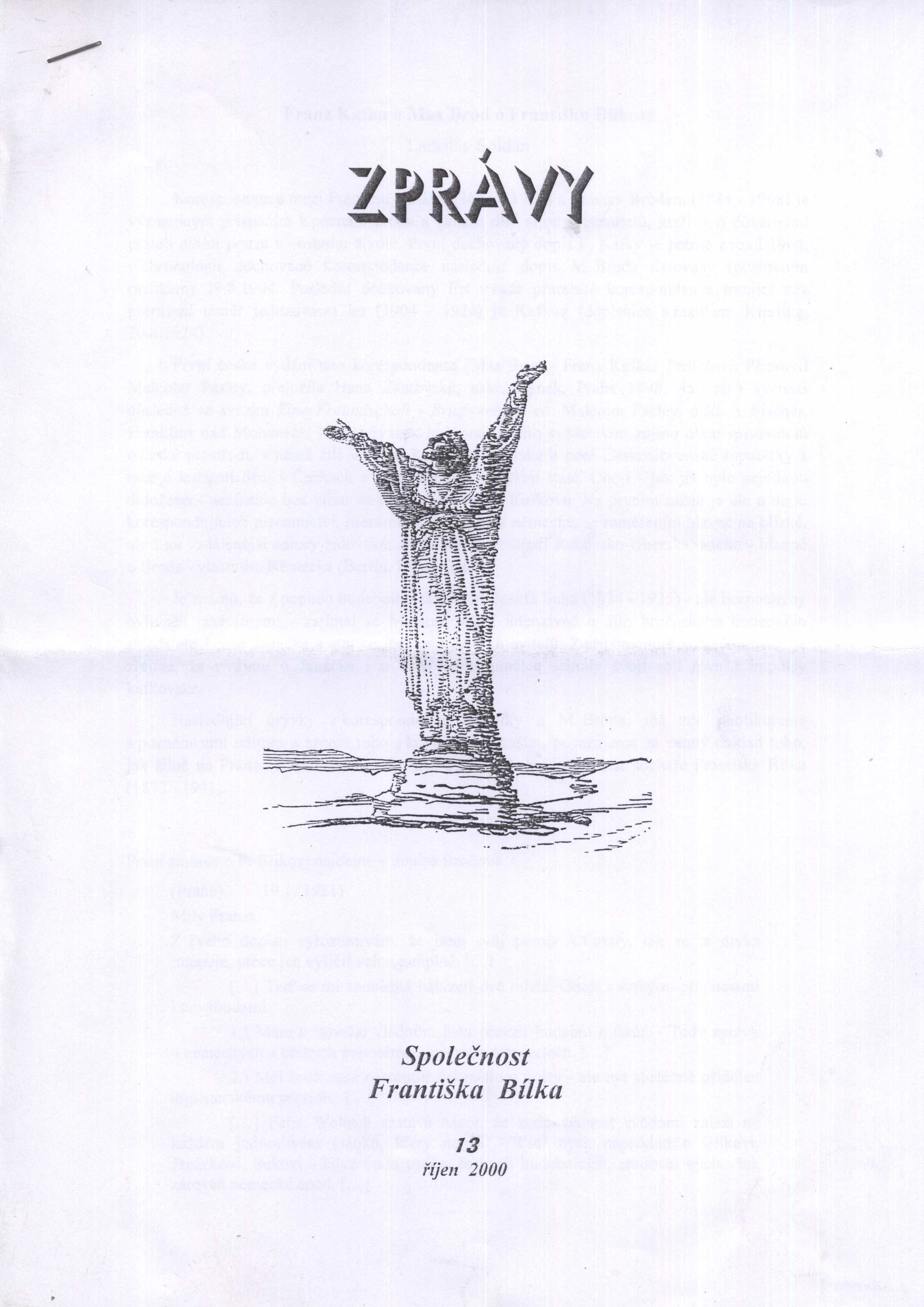 Title information Zprávy : Společnost Františka Bílka Roč., číslo 12, 13, 2000 Publication Praha : Společnost Františka Bílka, 2000 Scope ilustrace ; 30 cm ISSN 2464-5516 Country Czech Republic Language Czech Note Čb. ilustrace na přední straně. - Čb. ilustrace. - Rozmnoženo. - Listy sepnuté sešívačkou