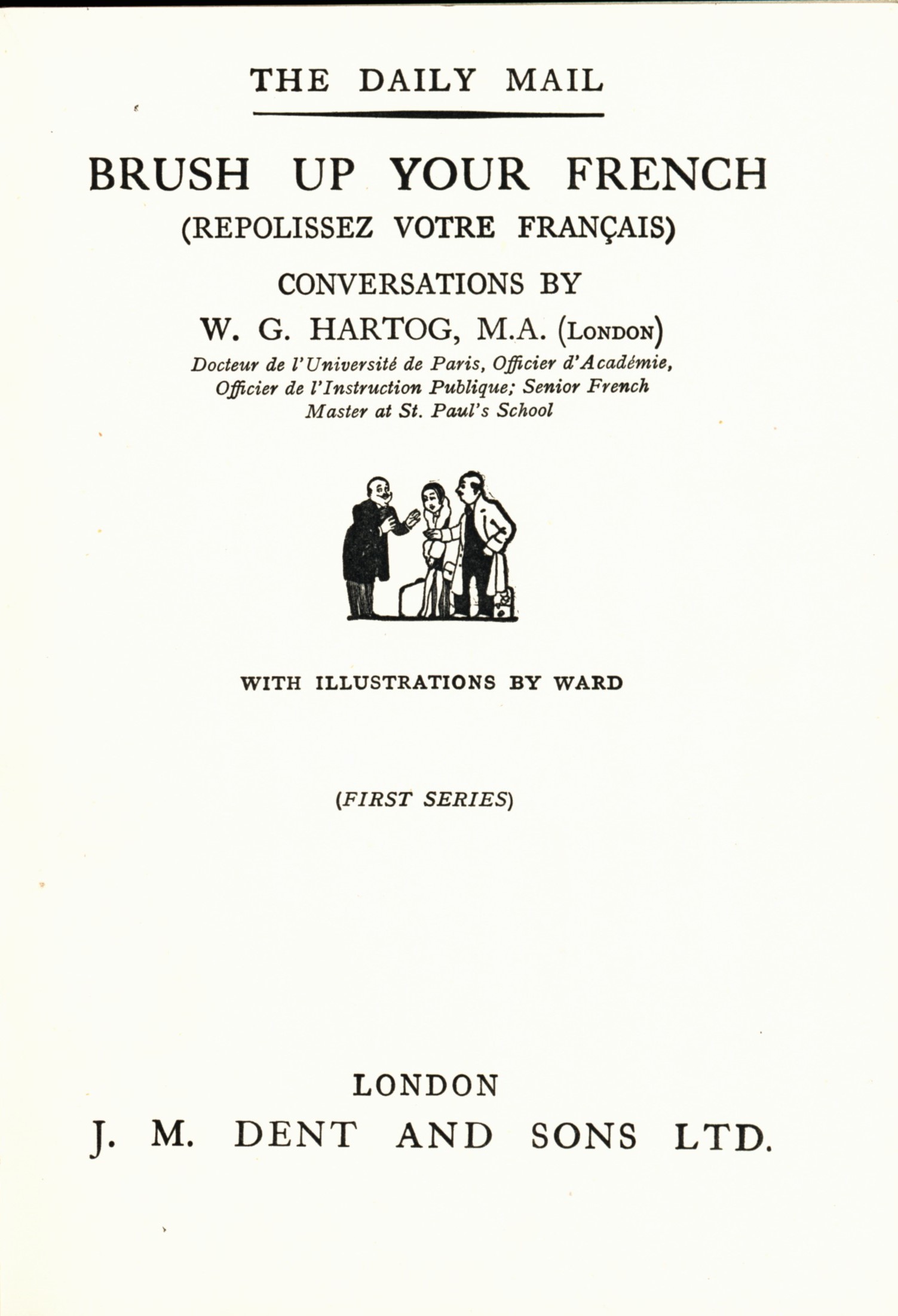 Title information Brush up your French = Repolissez votre français. (First series) / conversations by W.G. Hartog ; with illustrations by Ward Personal name Hartog, W. G. (Willie Gustave), 1876- (Author) Další autoři J. M. Dent (Londýn, Velká Británie) (Publisher) The Temple Press (tiskárna) (Printer) (Printer of plates) Publication London : J.M. Dent and Sons Ltd., [1937?] Manufacture Letchworth : The Temple Press Scope x, 109 stran : ilustrace ; 19 cm ISBN (Vázáno) Country United Kingdom Language English * French Note Nad názvem: "The Daily mail"