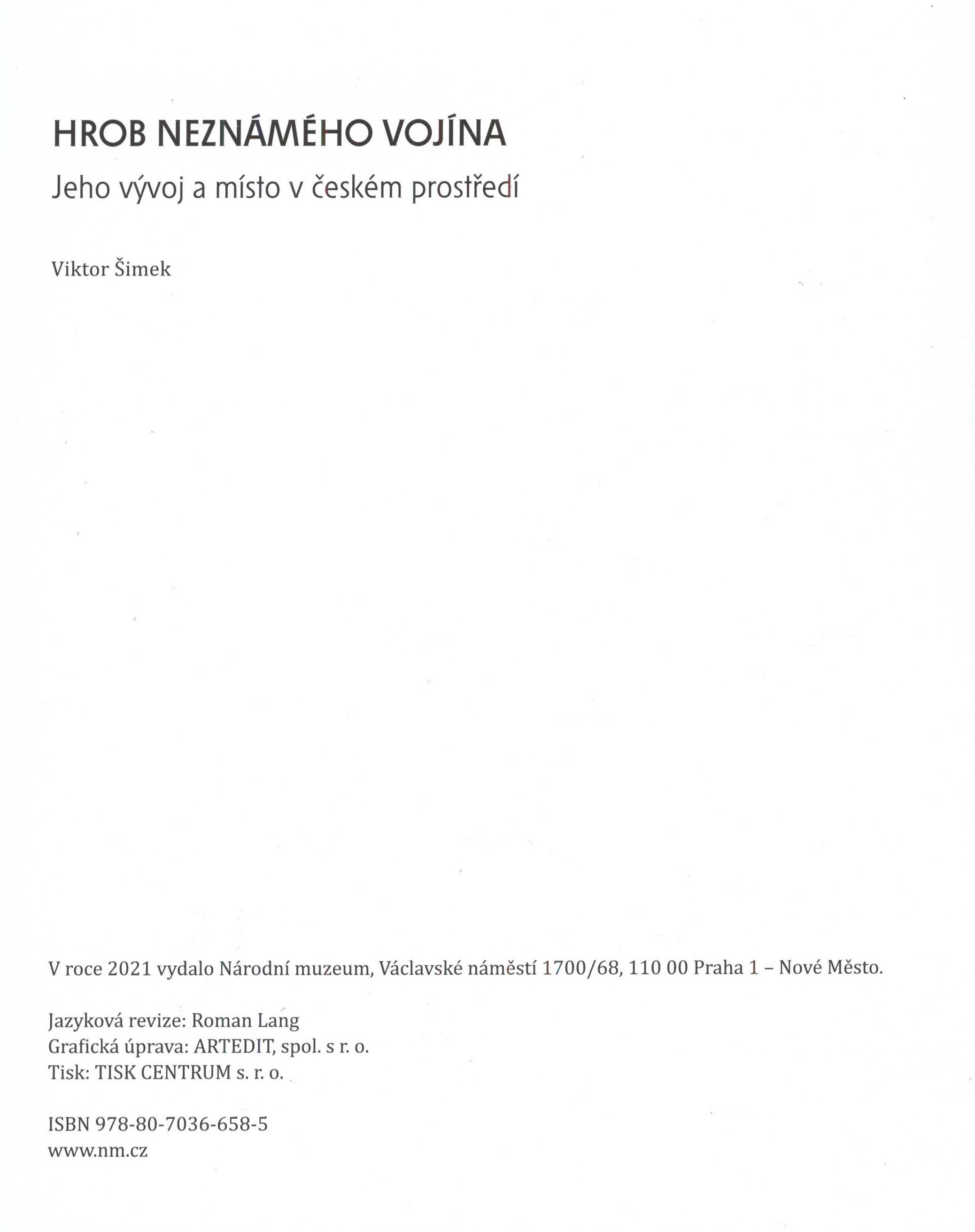 Title information Hrob neznámého vojína : jeho vývoj a místo v českém prostředí / Viktor Šimek ; grafická úprava ARTEDIT, spol. s r.o. Personal name Šimek, Viktor (Author) Další autoři ARTEDIT, spol. s r. o. (polygrafická společnost) (Book designer) Národní muzeum (Praha, Česko) (Publisher) Tisk Centrum (tiskárna) (Printer) Publication Praha : Národní muzeum, 2021 Manufacture TISK CENTRUM s.r.o. Scope 135 stran : ilustrace (některé barevné), portréty, faksimile ; 24 cm ISBN 978-80-7036-658-5 (brožováno) Country Czech Republic Language Czech Note Zdobená barevná obálka. - Poděkování. - Obsah. - Úvod. - Barevné, tónované a černobílé fotografie, ilustrace, portréty a faksimile s popiskami. - Závěr. - Anglické resumé. - Obsahuje bibliografii a bibliografické odkazy. - Soupis zdrojů příloh.