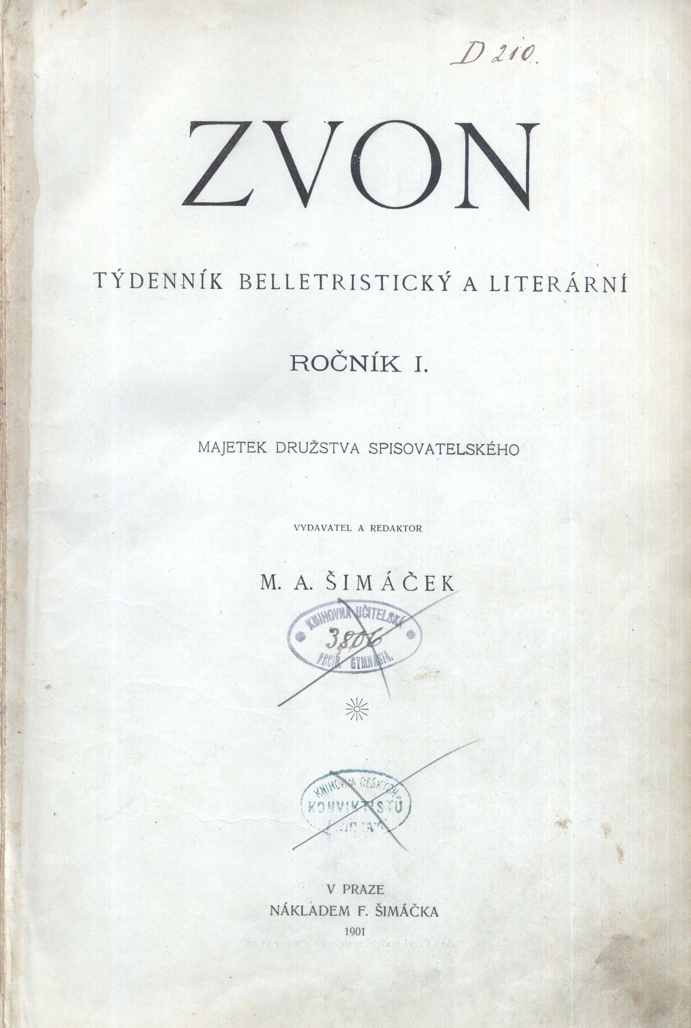 Title information Zvon : týdenník belletristický a literární Další autoři Šimáček, Matěj Anastasia, 1860-1913 (Publisher) (Redactor) Corporation Česká grafická akciová společnost Unie (v Praze) (Printer) Roč., číslo Ročník 1, číslo 1-52, 1901 Publication V Praze : Nákladem F. Šimáčka, 1901 Manufacture Tiskem České grafické společnosti "Unie" Scope 624 stran ; 28,5 cm Country Czech Republic Language Czech Note 1-52 (září 1900? - 20. září 1901)