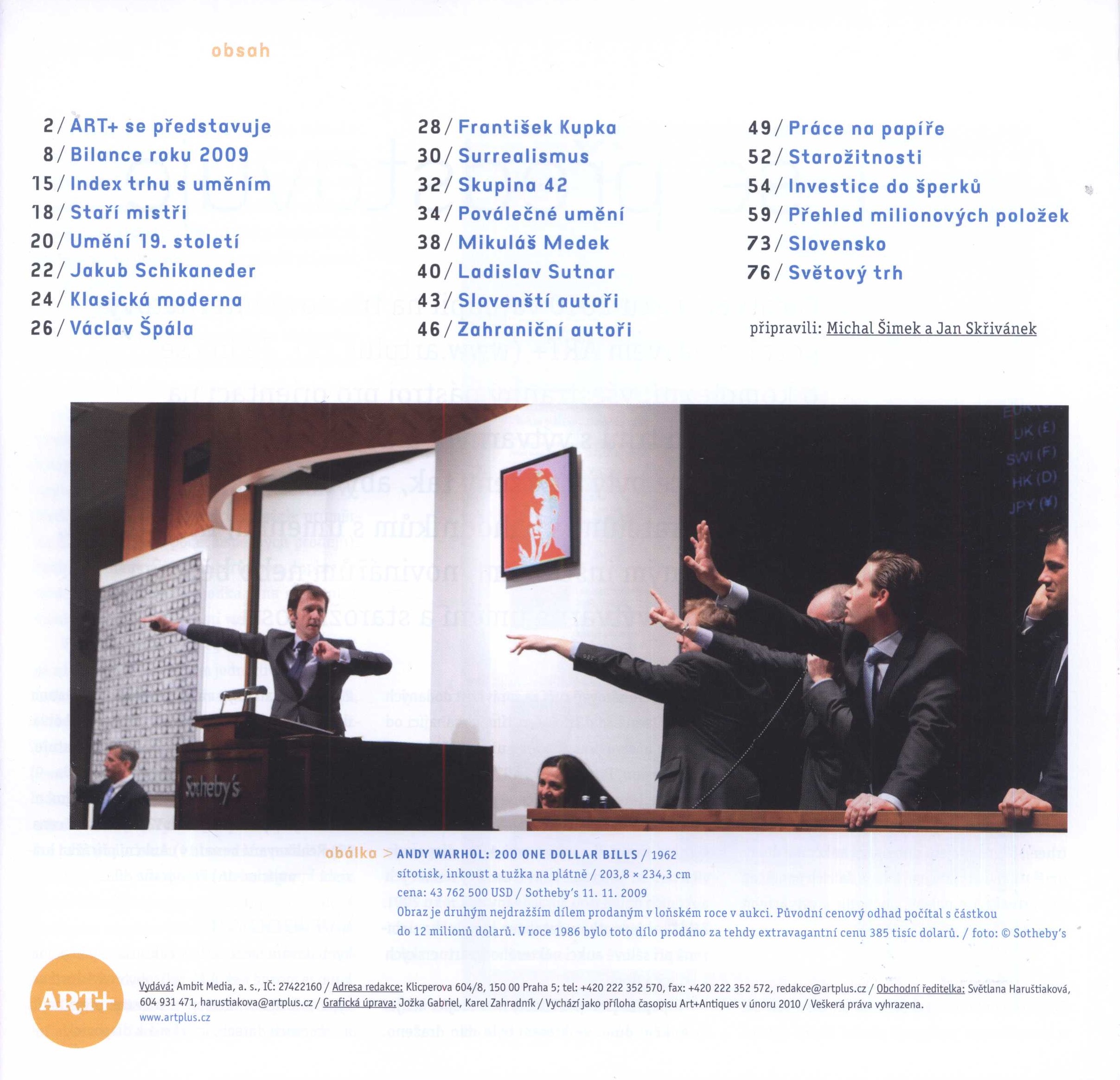 Title information Ročenka Art+ : trh s uměním v roce 2009 / připravili: Michal Šimek a Jan Skřivánek Další autoři Šimek, Michal (Compiler) Skřivánek, Jan, 1977- (Compiler) Corporation Ambit Media (vydavatelství) (Publisher) Roč., číslo 2009 Publication Praha : Ambit Media, a. s., 2010 Scope 80 stran : barevné ilustrace, grafy ; 20 x 22 cm ISBN 978-80-254-6667-4 (v knize neuvedeno ; brožováno) Country Czech Republic Language Czech Note Název z obálky. - Barevné fotografie a reprodukce uměleckých děl. - Grafy. - Vychází jako příloha časopisu Art+Antigues v únoru 2010