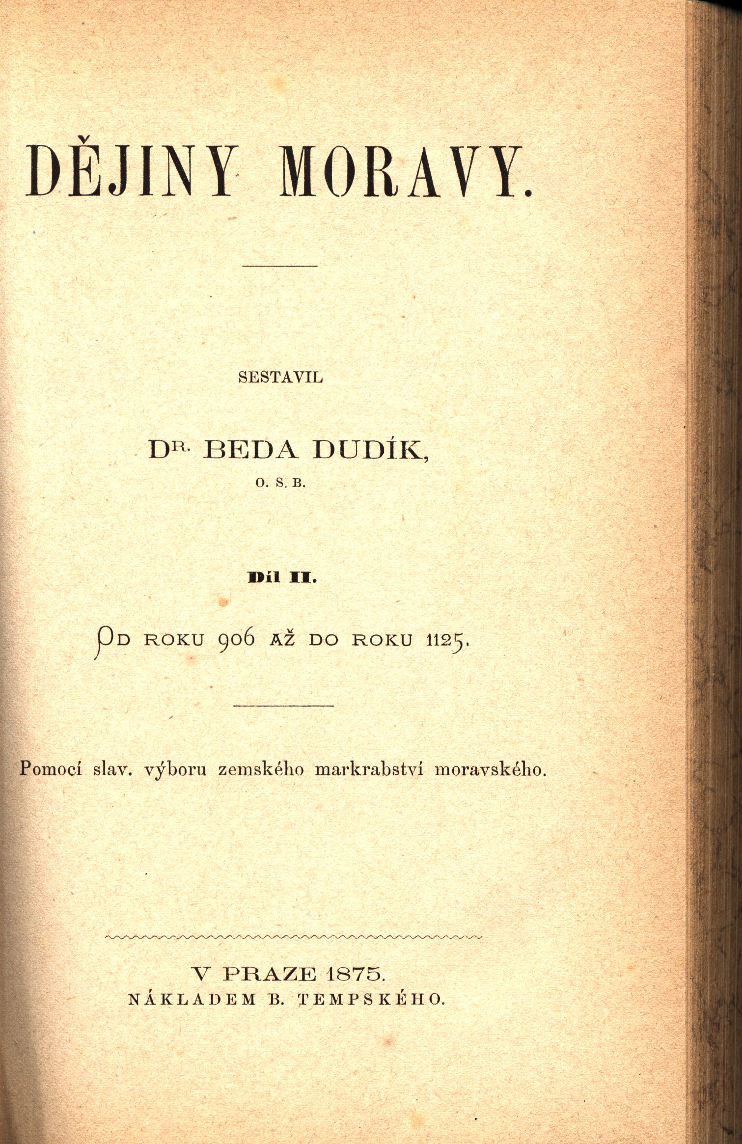 Title information Dějiny Moravy. Díl II, Od roku 906 až do roku 1125 / sestavil Beda Dudík Personal name Dudík, Beda, 1815-1890 (Author) Další autoři Tempsky, Friedrich, 1821-1902 (Publisher) Publication V Praze : nákladem B. Tempského, 1875 Scope 475 stran ; 21 cm ISBN (Vázáno) Country Czech Republic Language Czech Note [Vydáno] pomocí slav. výboru zemského markrabství moravského (titulní list).