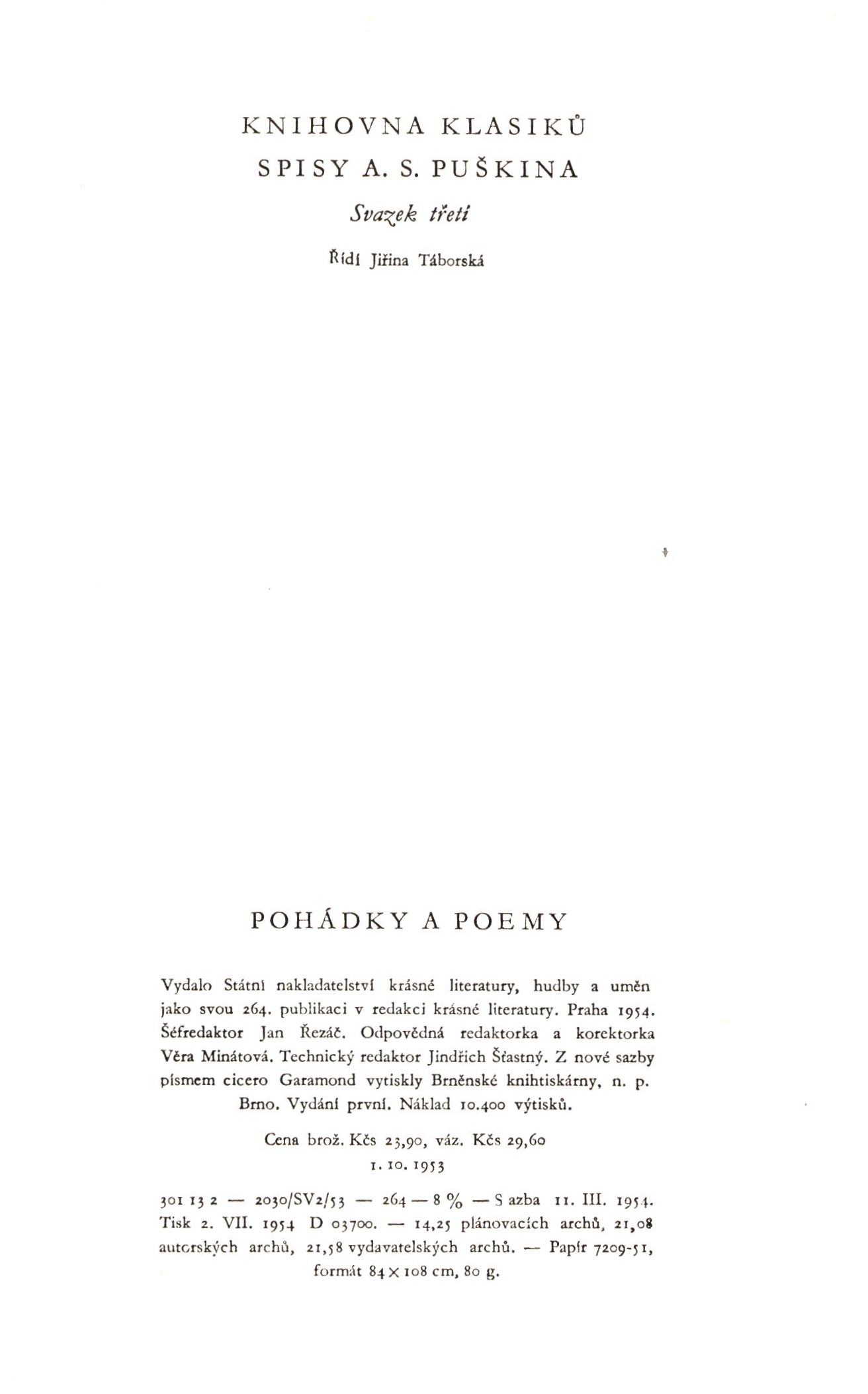 Knihovna klasiků, (Státní nakladatelství krásné literatury a umění)Spisy, Alexander Sergejevič Puškin, (SNKLHU)Country Czech Republic Language Czech Language of the original Russian Note Barevná zdobená obálka. - Modrá plátěná obálka s ražbou. - Frontispis. - Poznámky a vysvětlivky. - 10 400 výtisků.