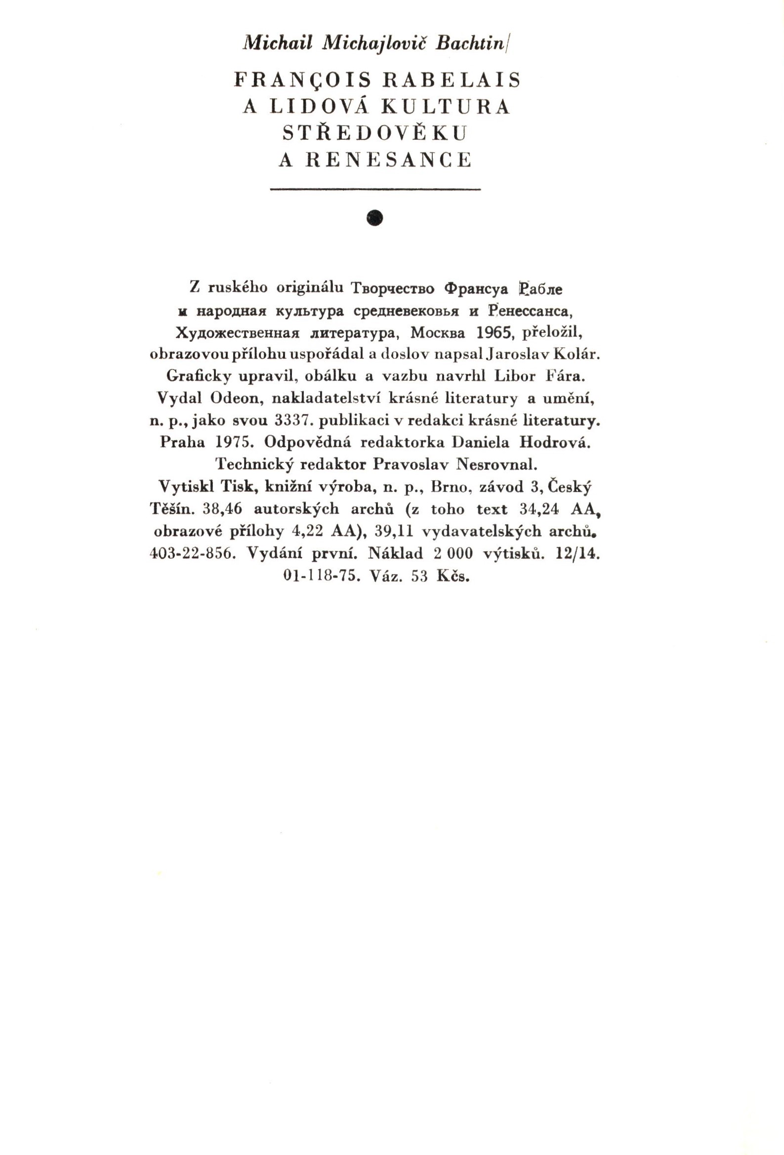 Title information François Rabelais a lidová kultura středověku a renesance / Michail Michajlovič Bachtin ; přeložil, obrazovou přílohu uspořádal a doslov napsal Jaroslav Kolár ; graficky upravil, obálku a vazbu navrhl Libor Fára Personal name Bachtin, Michail Michajlovič, 1895-1975 (Author) Další autoři Kolár, Jaroslav, 1929-2013 (Translator) (Author of afterword, colophon, etc.) Fára, Libor, 1925-1988 (Book designer) (Bookjacket designer) Corporation Odeon (nakladatelství) (Publisher) Tisk Brno (tiskárna) (Printer) Edition statement vydání první Publication Praha : Odeon, 1975 Manufacture Brno : Tisk Scope 406 stran, 48 nečíslovaných stran obrazových příloh : ilustrace (některé barevné), faksimile ; 22 cm ISBN (Vázáno) Country Czech Republic Language Czech Language of the original Russian Note Barevná zdobená obálka. - Oranžová plátěná vazba s ražbou. - Zdobená přídeští. - Frontispis. - Ilustrovaný titulní list. - Ilustrace. - Rejstřík jmen a anonymních děl. - 2 000 výtisků.