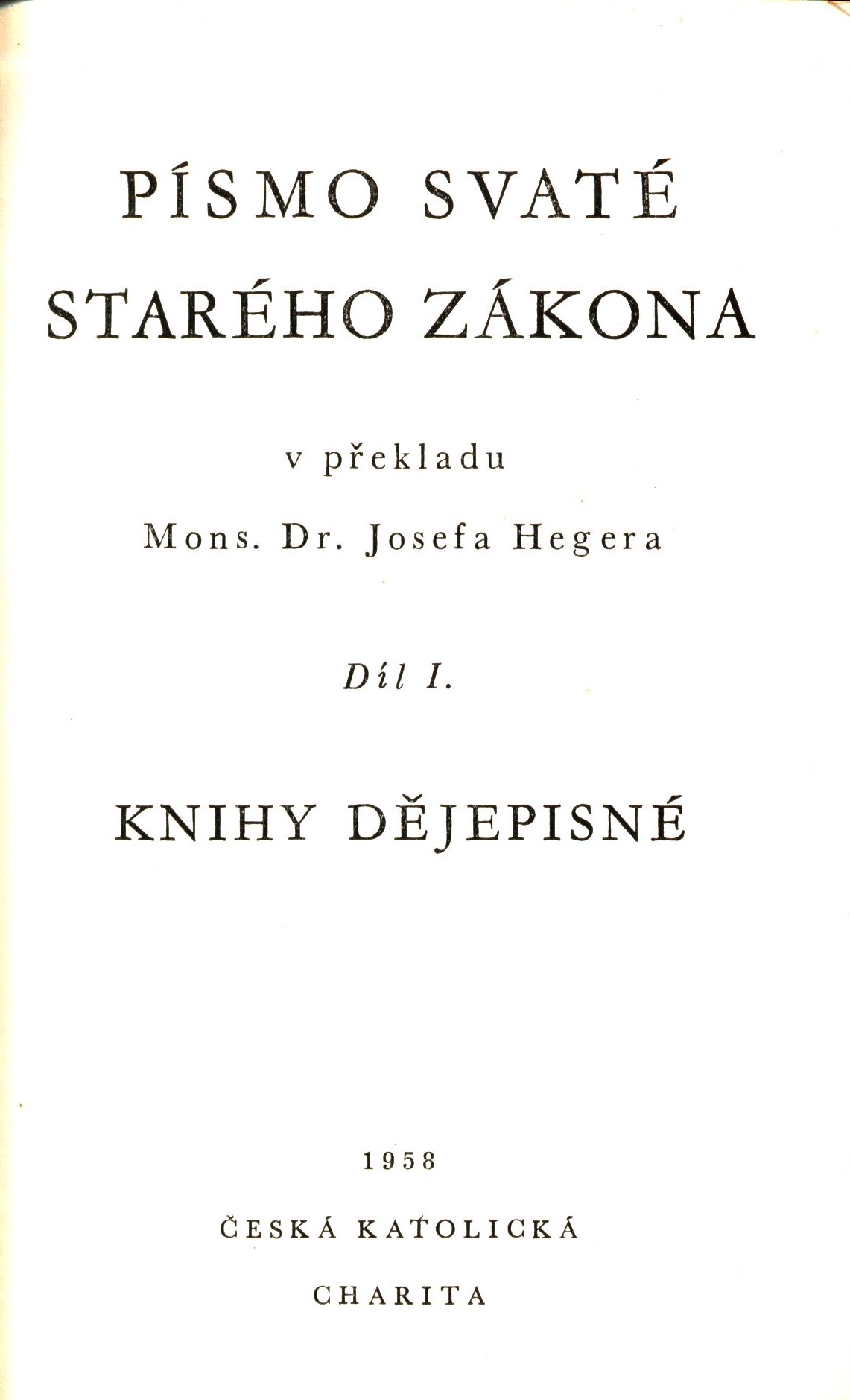 Title information Písmo svaté Starého zákona. Díl I., Knihy dějepisné / v překladu Josefa Hegera ; odborně upravili Jan Merell a Frantisek Kotalík ; graficky upravil Rudolf Hála Další autoři Heger, Josef, 1885-1952 (Translator) Merell, Jan, 1904-1986 (Editor) Kotalík, František, 1917-1993 (Editor) Hála, Rudolf, 1892-1968 (Book designer) Corporation Katolická církev. Česká katolická charita (Publisher) Ústřední církevní nakladatelství (Publisher) Tisk Brno (tiskárna) (Printer) Edition statement první vydání Publication Praha : Ústřední církevní nakladatelství, 1958 Manufacture Brno : Tisk, knižní výroba, n.p. Scope 1236 stran ; 18 cm ISBN (vázáno) Edition Spisy Římskokatolické Cyrilometodějské bohoslovecké fakulty v Praze-Litoměřicích