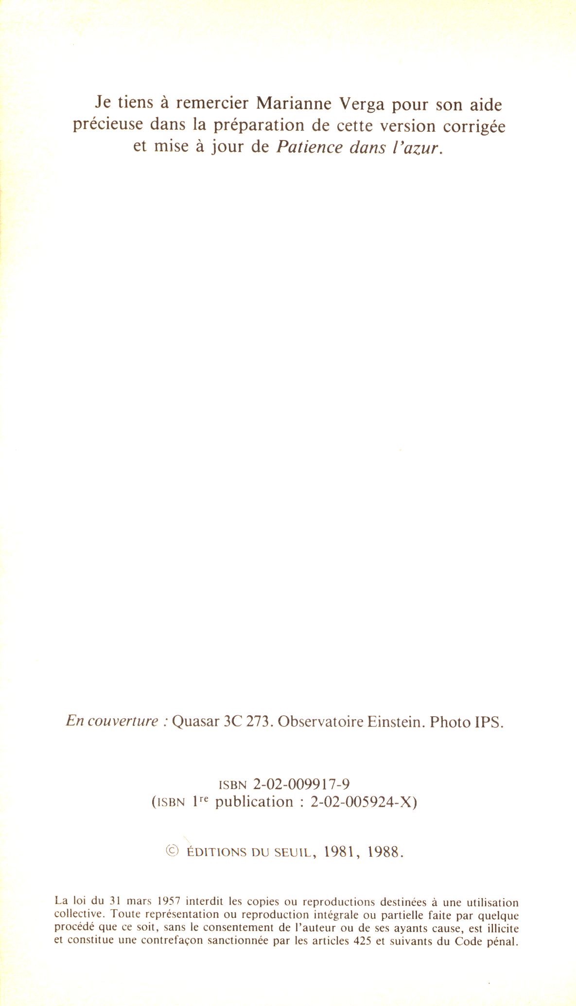 Title information Patience dans l'azur : l'évolution cosmique / Hubert Reeves Personal name Reeves, Hubert, 1932- (Author) Další autoři Éditons du Seuil (nakladatelství) (Publisher) Brodard et Taupin (Printer) Edition statement Nouvelle édition Publication Paris : Éditions du Seuil, 1988 Manufacture Brodard et Taupin Scope 324 stran : ilustrace ; 18 cm ISBN 2-02-009917-9 (brožováno) Edition Points, Sciences ; S 55