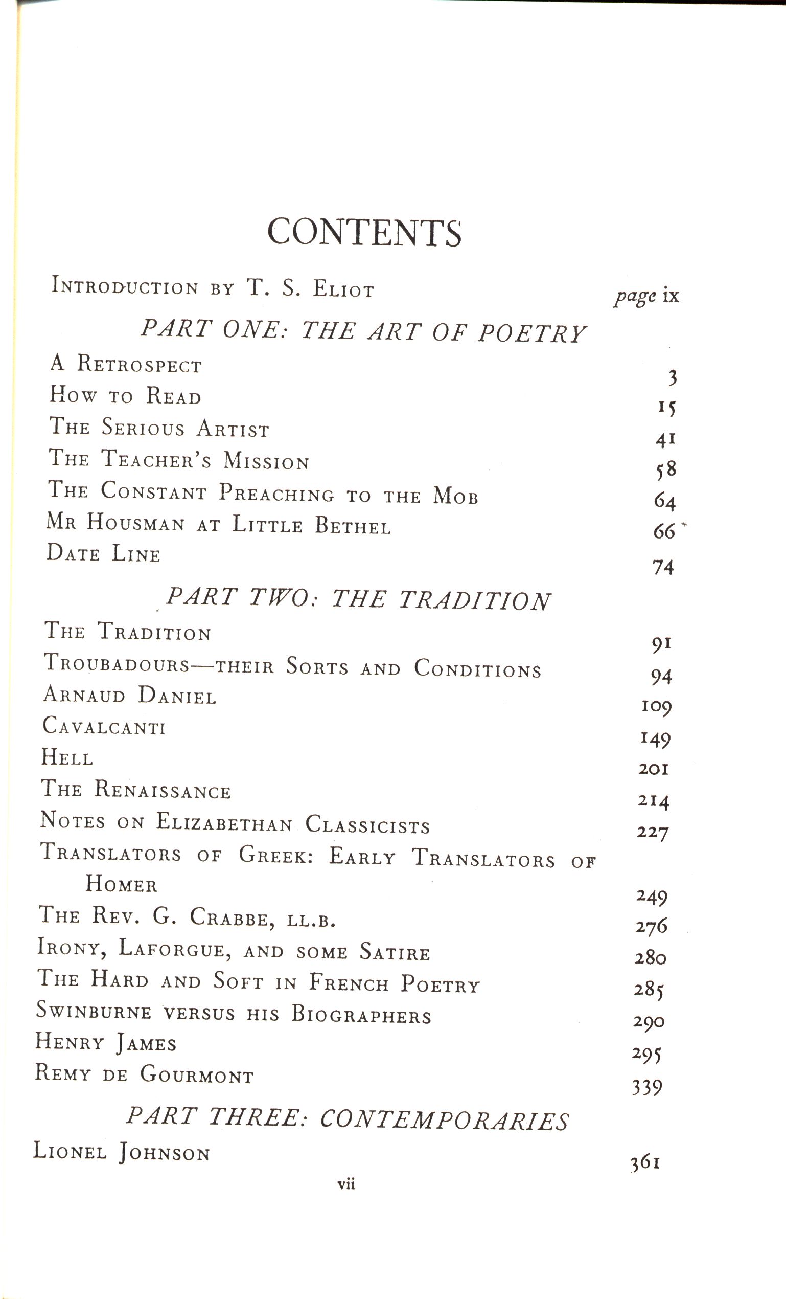 Title information Literary essays of Ezra Pound / edited with an introduction by T.S. Eliot Personal name Pound, Ezra, 1885-1972 (Author) Další autoři Eliot, T. S. (Thomas Stearns) 1888-1965 (Editor) Corporation Faber and Faber (Publisher) Oxford University Press (firma) (Printer) Edition statement Reprinted 1963 Publication London : Faber and Faber Limited, 1960 Manufacture Oxford : University Press Scope 464 stran ; 22 cm ISBN (brožováno) Country United Kingdom Language English Note Barevná zdobená obálka. - Na předním přídeští recenze. - Na frontispisu soupis knih autora. - Obsah.