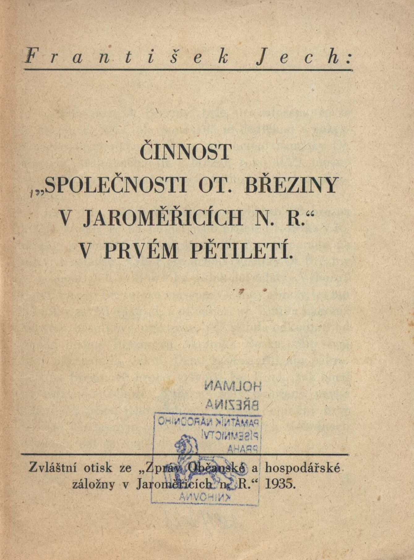 Issue dataV Jaroměřicích n. Rok. : Společnost Ot. Březiny, 1935 (Josef Peksa)