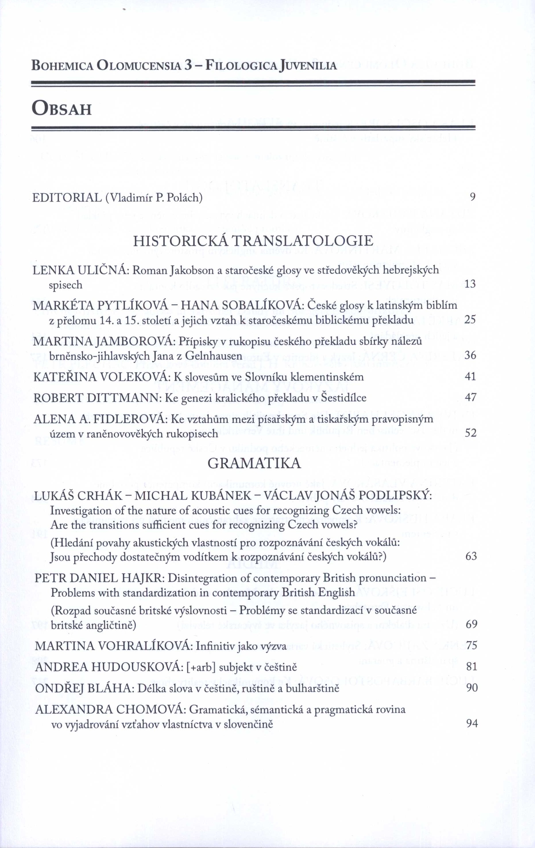 Title information Bohemica Olomucensia. Filologica Juvenilia Další autoři Machala, Lubomír, 1958- (Publishing director) Corporation Univerzita Palackého (Olomouc, Česko) (Publisher) (Printer) Roč., číslo Ročník 1, číslo 3, 2009 Publication Olomouc : Univerzita Palackého v Olomouci, 2009 Scope 287 stran : fotografie, grafy ; 25 cm ISSN 1803-876X Country Czech Republic Language Czech * Slovak * English * German Note Čb. fotografie a grafy. - Text částečně slovensky, anglicky a německy. - Anglická resumé