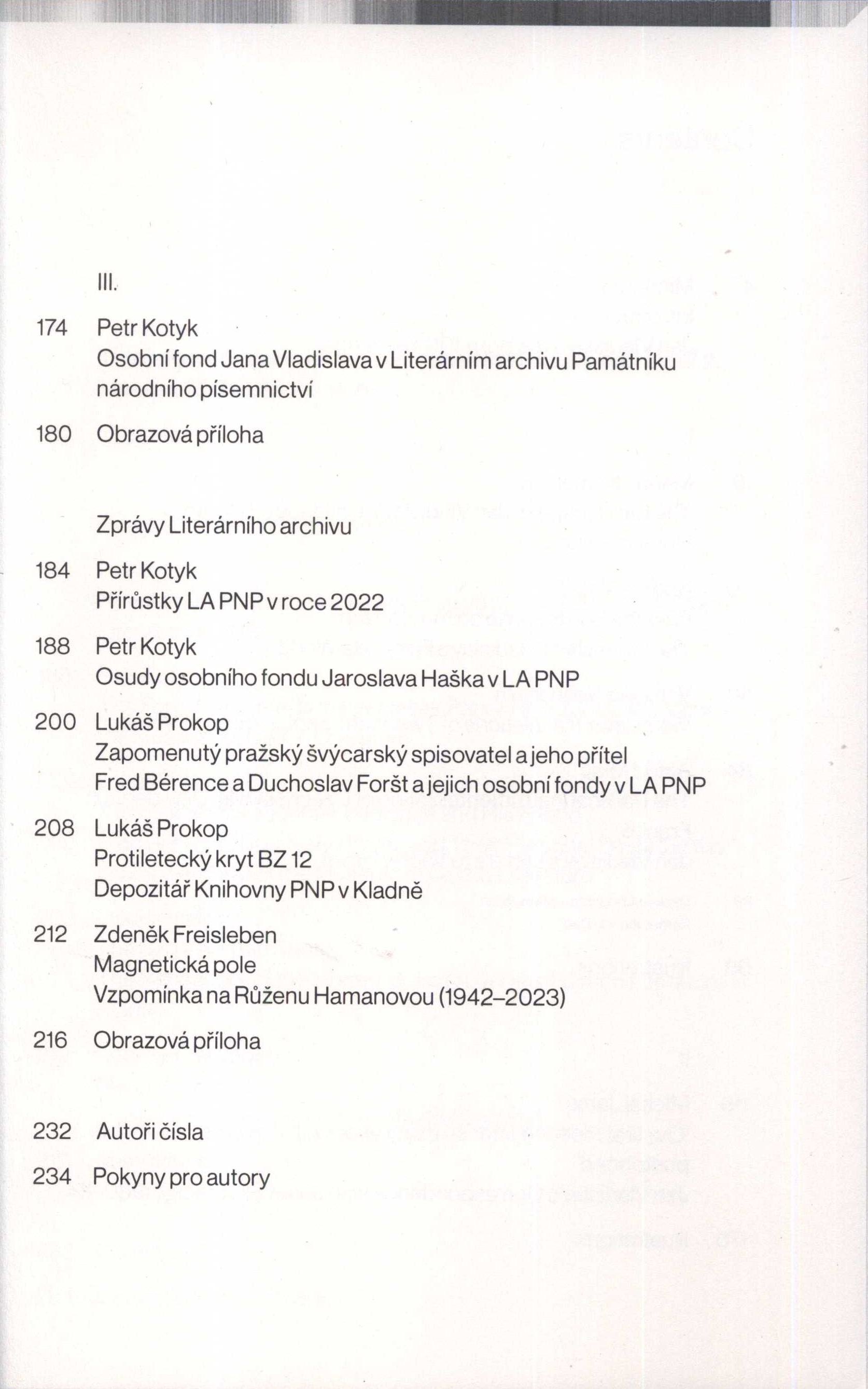 Title information Literární archiv : sborník Památníku národního písemnictví = Jahrbuch des Museums der tschechischen Literatur = Annual of the Museum of Czech Literature = Almanach du Musée de la littérature tchèque. Jan Vladislav. Ke 100. výročí narození / editor Michal Jareš Další autoři Jareš, Michal, 1973- (Editor) Sudzinová, Tereza, 1991- (Publishing director) Paton, Derek, 1958- (Translator) Corporation Památník národního písemnictví (muzeum literatury) (Publisher) Indigoprint (tiskárna) (Printer) Roč., číslo 55, 2023 Edition statement Vydání první Publication Praha : Památník národního písemnictví / Muzeum literatury, 2023 Manufacture Indigoprint Scope 238 stran : ilustrace, fotografie, portréty, faksimile ; 22,5 cm ISBN 978-80-88503-23-1 (brožováno) ISSN 0231-5904 Country Czech Republic Language Czech * Slovak Note Barevná typografická obálka se slepotiskem. - Zdobená ořízka. - Čb. i barevné ilustrace, fotografie, portréty a faksimile. - Seznam autorů. - 300 výtisků