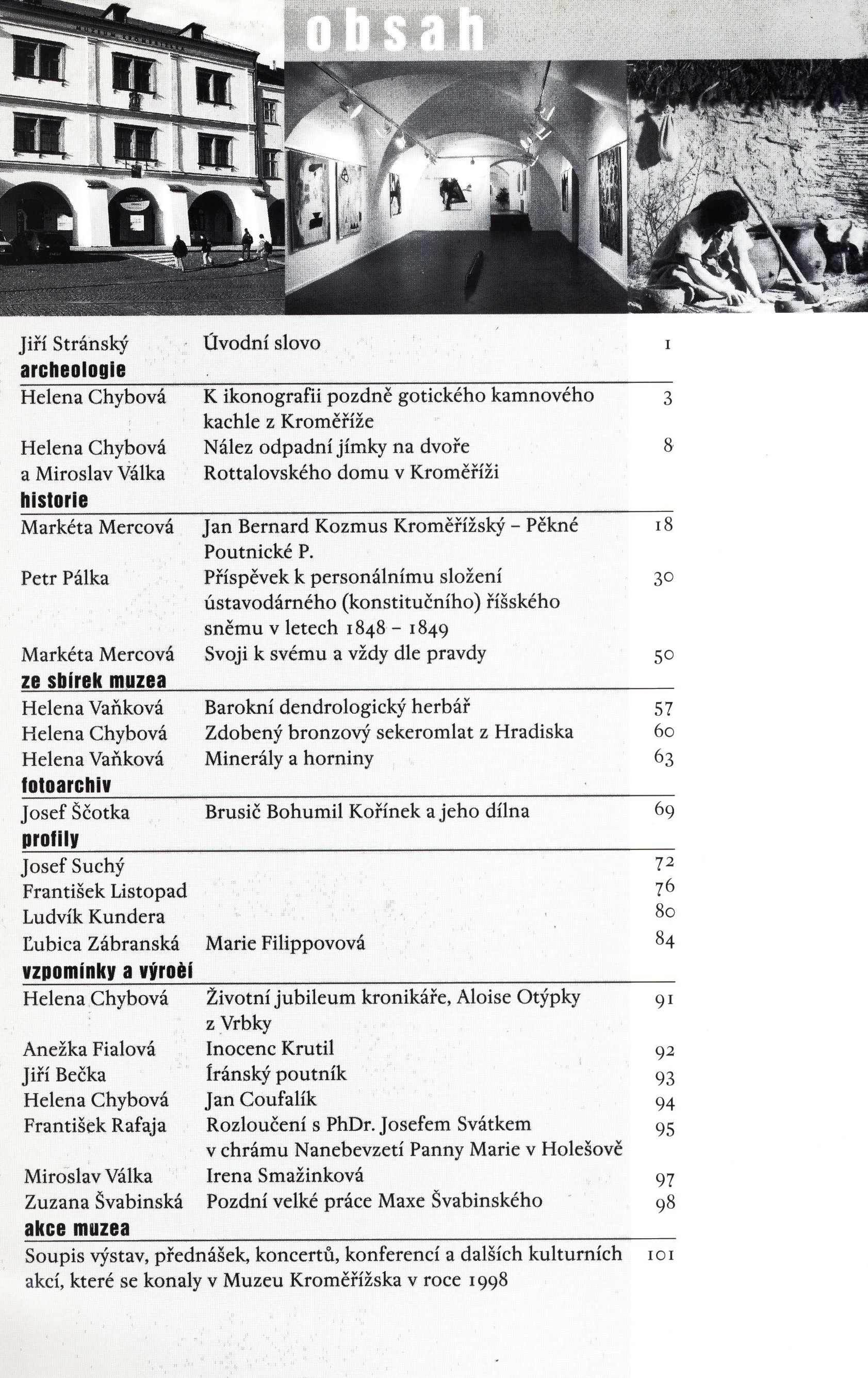 Note Typografická obálka. - Obsah. - Úvodní slovo. - Černobílé fotografie a ilustrace. - Příloha "Vzpomínky a výročí". - Tiráž.