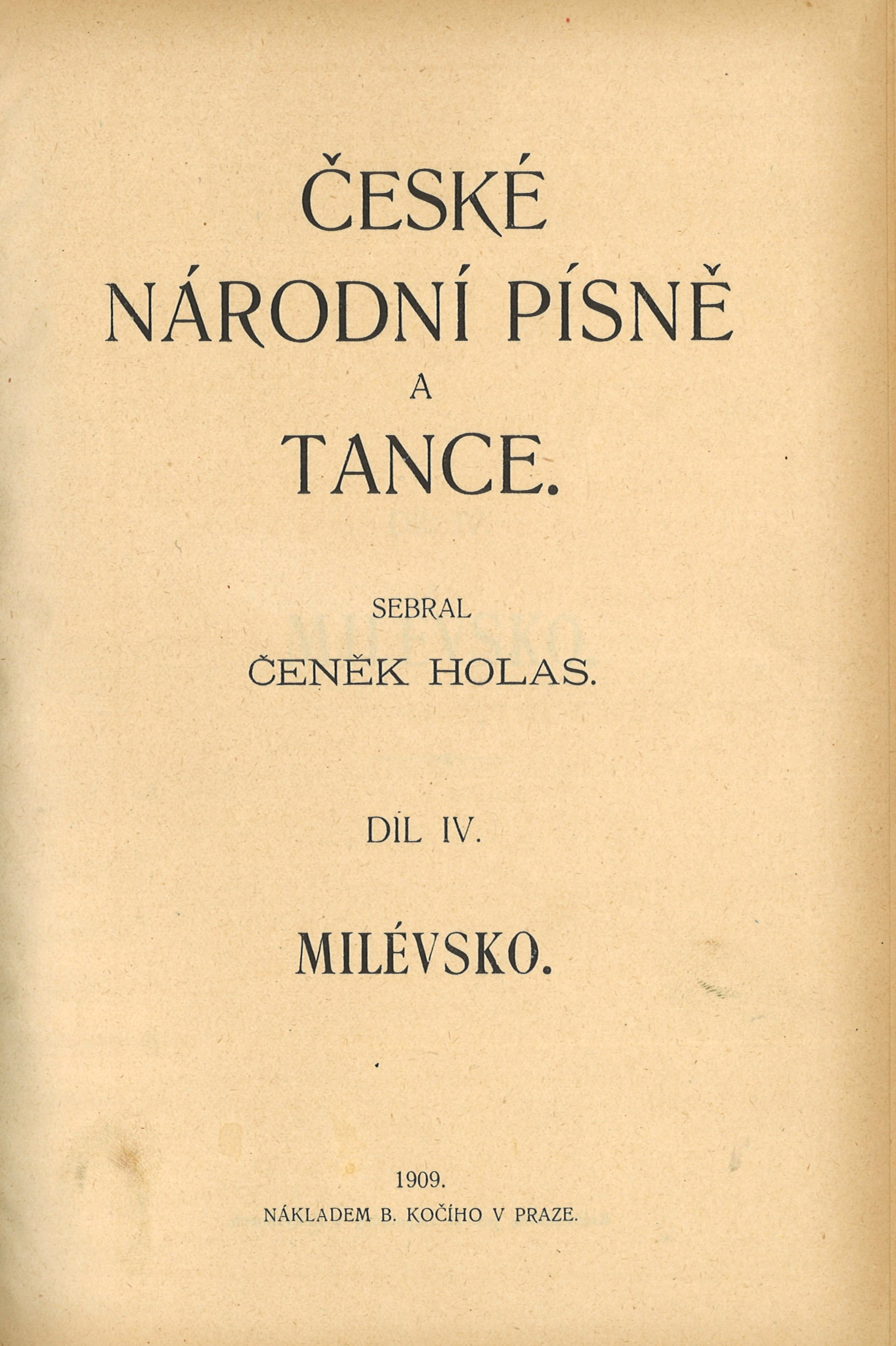 Title information České národní písně a tance. Díl IV, Milévsko / sebral Čeněk Holas Personal name Holas, Čeněk, 1855-1939 (Collector) (Compiler) Další autoři B. Kočí (nakladatelství a knihkupectví) (Publisher) Knihtiskárna Jos. B. Zápotočný (v Rokycanech) (Printer) Publication V Praze : nákladem B. Kočího, 1909 Manufacture V Rokycanech : Knihtiskárna Jos. B. Zápotočný Scope 259 stran : noty ; 24 cm ISBN (Vázáno) Country Czech Republic Language Czech Note Šest dílů v jednom svazku. - Poslední díl obsahuje zároveň díl V a díl VI. - Společná poloplátěná vazba se zlacením. - Společná předmluva v 1. dílu. - Rejstřík písní podle jejich začátků. - Vlastní titulní list