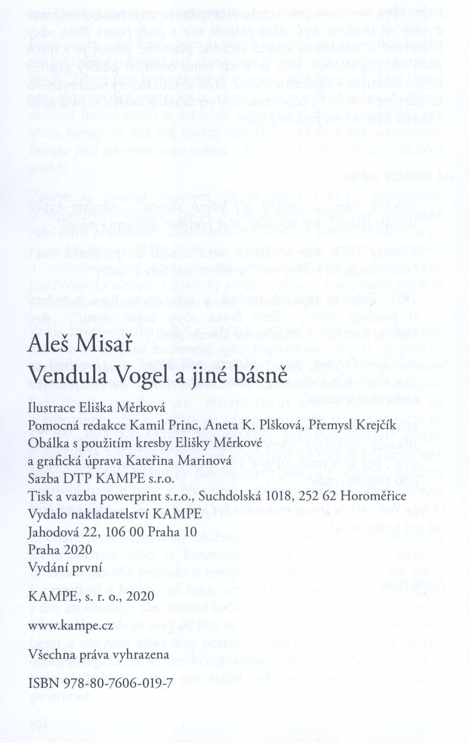 Title information Vendula Vogel a jiné básně / Aleš Misař ; ilustrace Eliška Měrková ; obálka s použitím kresby Elišky Měrkové a grafická úprava Kateřina Marinová Personal name Misař, Aleš, 1984- (Author) Další autoři Měrková, Eliška (Illustrator) Marinová, Kateřina, 1951- (Bookjacket designer) (Book designer) Princ, Kamil, 1987- (Author of afterword, colophon, etc.) Corporation Kampe (vydavatelství) (Publisher) Powerprint (firma) (Printer) Edition statement Vydání 1. Publication Praha : KAMPE, 2020 Manufacture Horoměřice : powerprint s.r.o. Scope 109 stran : barevné ilustrace ; 21 cm + CD-ROM ISBN 978-80-7606-019-7 (brožováno) Country Czech Republic Language Czech Note Obálka s barevnou ilustrací, bílý text. - Obsah. - Celostránkové barevné ilustrace. - Doslov K. Prince. - Na rubu zadní strany obálky vlepeno průsvitné pouzdro s CD.