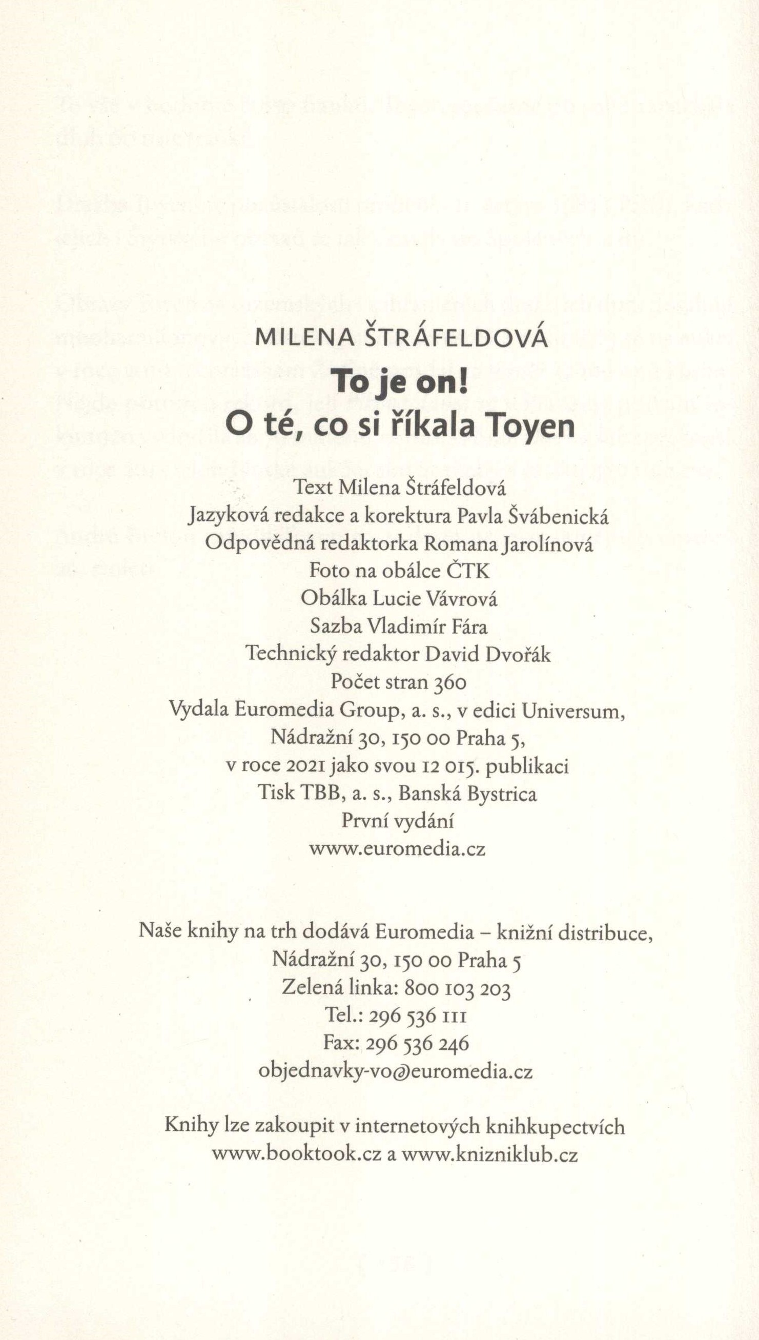 Title information To je on! : o té, co si říkala Toyen / Milena Štráfeldová ; obálka Lucie Vávrová Personal name Štráfeldová, Milena, 1956- (Author) Další autoři Vávrová, Lucie (Bookjacket designer) Corporation Euromedia Group, a.s. - Universum (nakladatelství) (Publisher) Tlačiareň BB (tiskárna) (Printer) Edition statement První vydání Publication Praha : Euromedia Group, 2021 Manufacture Banská Bystrica : TBB, a.s. Scope 358 stran ; 24 cm ISBN 978-80-242-7313-6 (vázáno) Country Czech Republic Language Czech Note Na obáce černobílá fotografie Toyen, barevný text. - Na přední záložce úryvek z textu, na zadní drobné barevné foto autorky a její stručná biografie a bibliografie. - Bílá vazba s černobílou fotografií Toyen, barevný text. - Citace. - Co dodat. - Anotace knihy na zadní straně obálky. - Přebal.