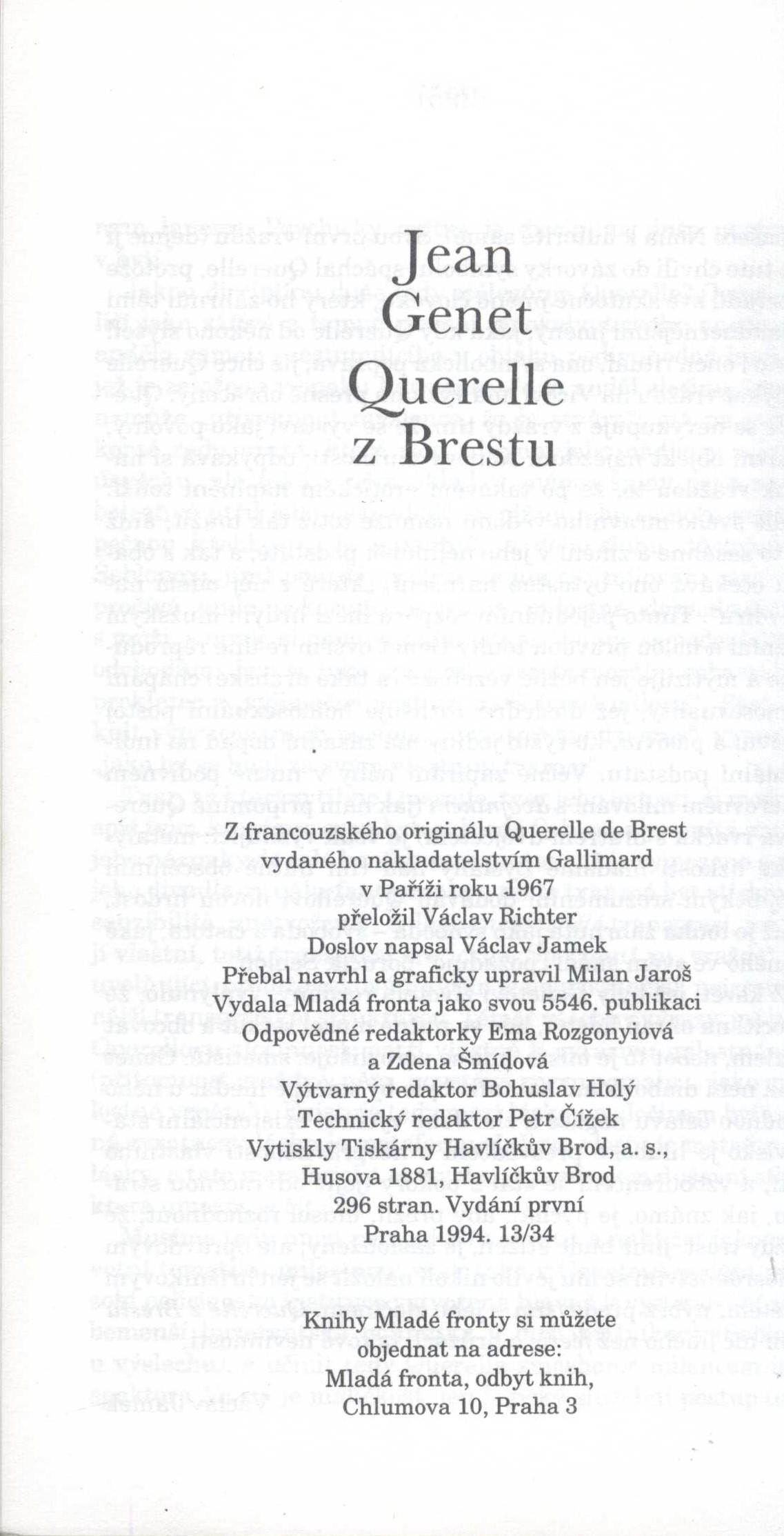 1. Title informationQuerelle z Brestu / Jean Genet ; z francouzského originálu Querelle de Brest ... přeložil Václav Richter
