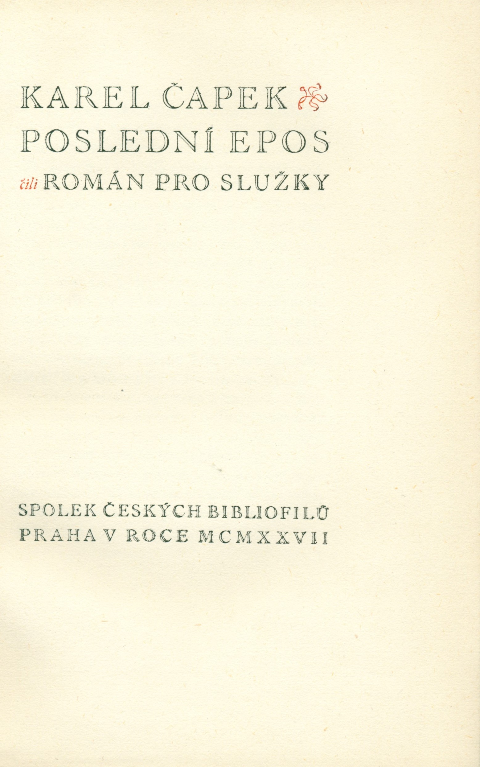Title information Poslední epos, čili, Román pro služky / Karel Čapek Personal name Čapek, Karel, 1890-1938 (Author) Další autoři Hála, Rudolf, 1892-1968 (Typographer) (Book designer) Corporation Spolek českých bibliofilů v Praze (Publisher) Orbis (tiskárna) (Printer) Edition statement První vydání Publication Praha : Spolek českých bibliofilů, 1927 Manufacture V Praze knihtiskárna Orbis Scope 25 stran ; 22 cm ISBN (Vázáno) Country Czech Republic Language Czech Note Podle návrhu Rudolfa Hály