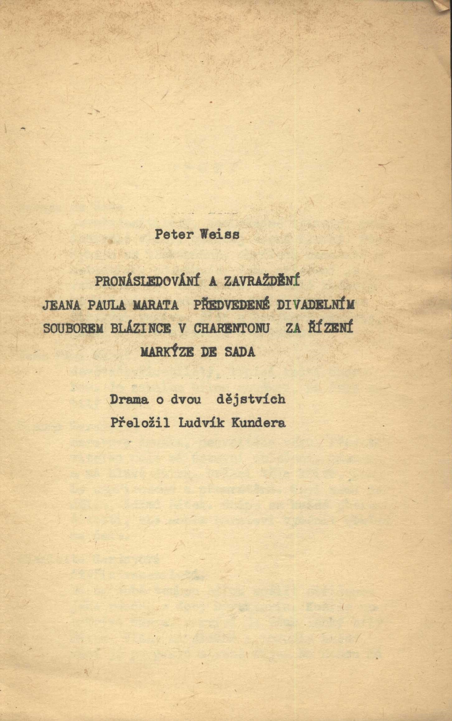 1. Title informationPronásledování a zavraždění Jeana Paula Marata předvedené divadelním souborem blázince v Charentonu za řízení markýze de Sada : drama o dvou dějstvích / Peter Weiss ; z německého originálu Die Verfolgung und Ermordung Jean Paul Marats dargestellt durch die Schauspielgruppe des Hospizes zu Charenton unter Anleitung des Herrn de Sade ... přeložil Ludvík Kundera
