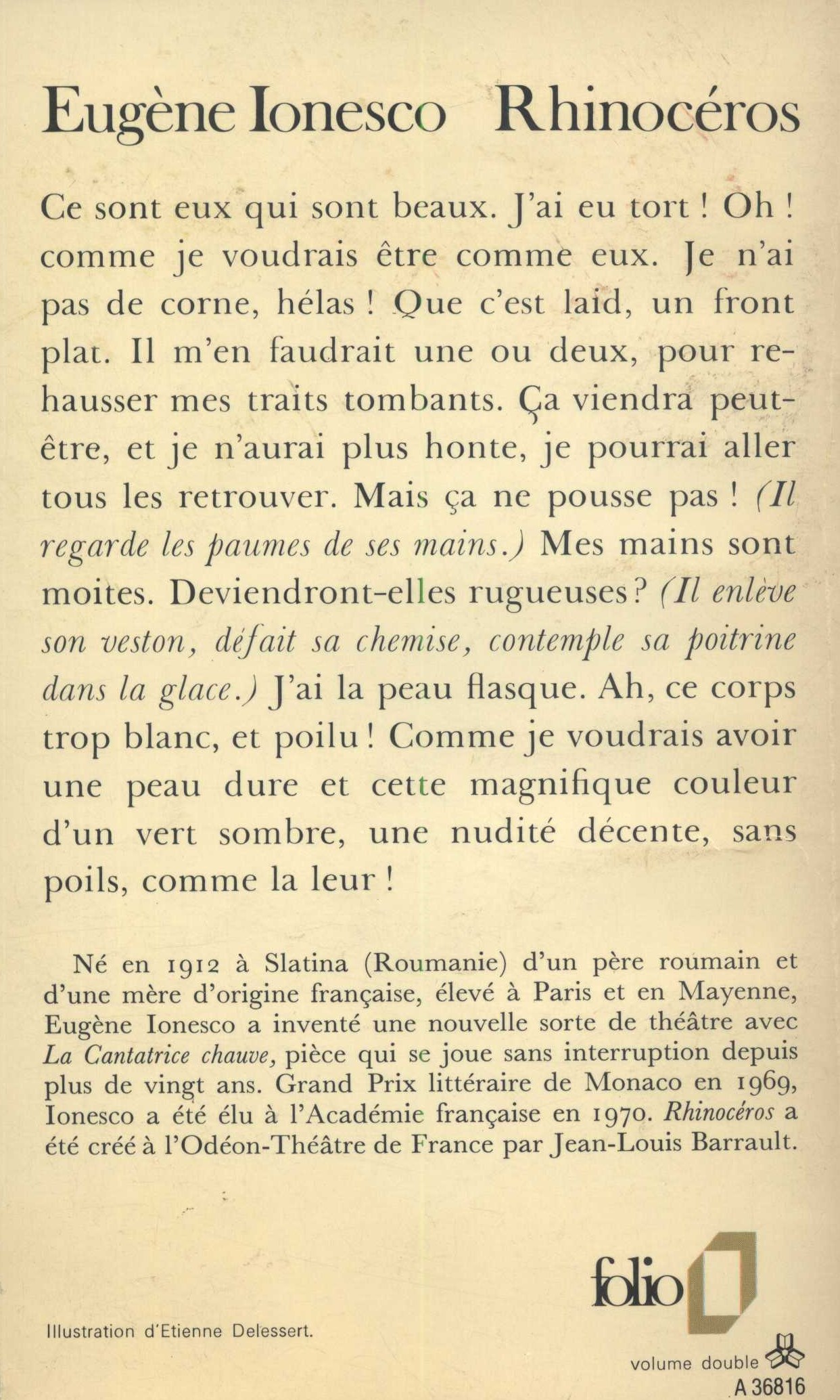 Title information Rhinocéros : pièce en trois actes et quatre tableaux / Eugène Ionesco Personal name Ionesco, Eugène, 1909-1994 (Author) Další autoři Delessert, Etienne, 1941-2024 (Illustrator) Corporation Gallimard (firma) (Publisher) Floch (francouzská tiskárna) (Printer) Publication [Paris] : Gallimard, 1981 Manufacture Mayenne : Imprimerie Floch Scope 246 stran ; 18 cm ISBN (Brožováno) Edition Collection Folio, texte intégral, volume double