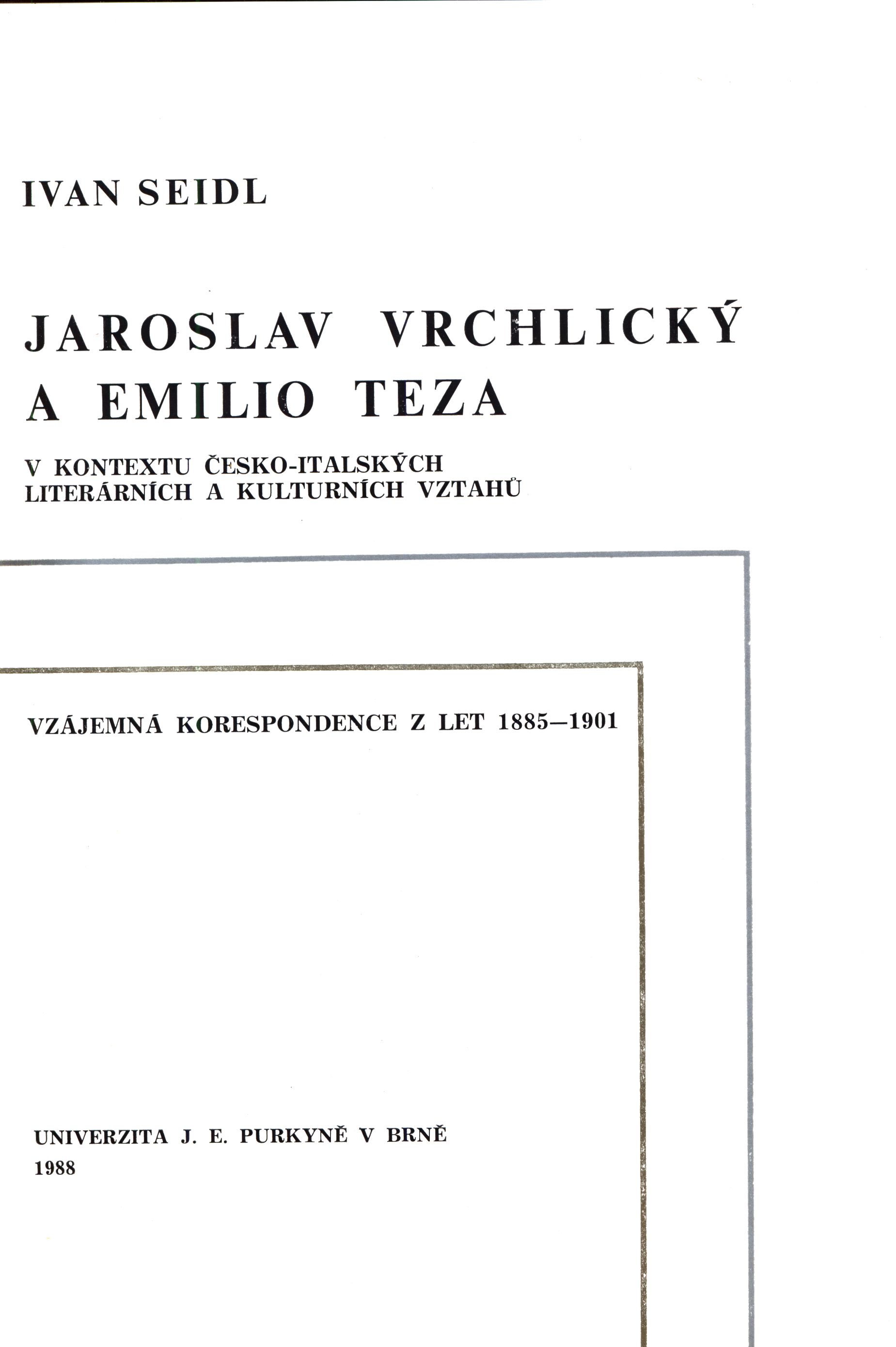 Title information Jaroslav Vrchlický a Emilio Teza v kontextu česko-italských literárních a kulturních vztahů : vzájemná korespondence z let 1885-1901 / Ivan Seidl Personal name Seidl, Ivan, 1947-2000 (Author) Další autoři Univerzita J.E. Purkyně v Brně (Publisher) Tisk Brno (tiskárna) (Printer) Edition statement Vydání první Publication V Brně : Univerzita J.E. Purkyně, 1988 Manufacture Český Těšín : Tisk, n.p., závod 3 Scope 263 stran : portréty, faksimile ; 25 cm ISBN (Vázáno) Edition Opera Universitatis Purkynianae Brunensis. Facultas philosophica = Spisy University J.E. Purkyně v Brně. Filosofická fakulta ; č. 280