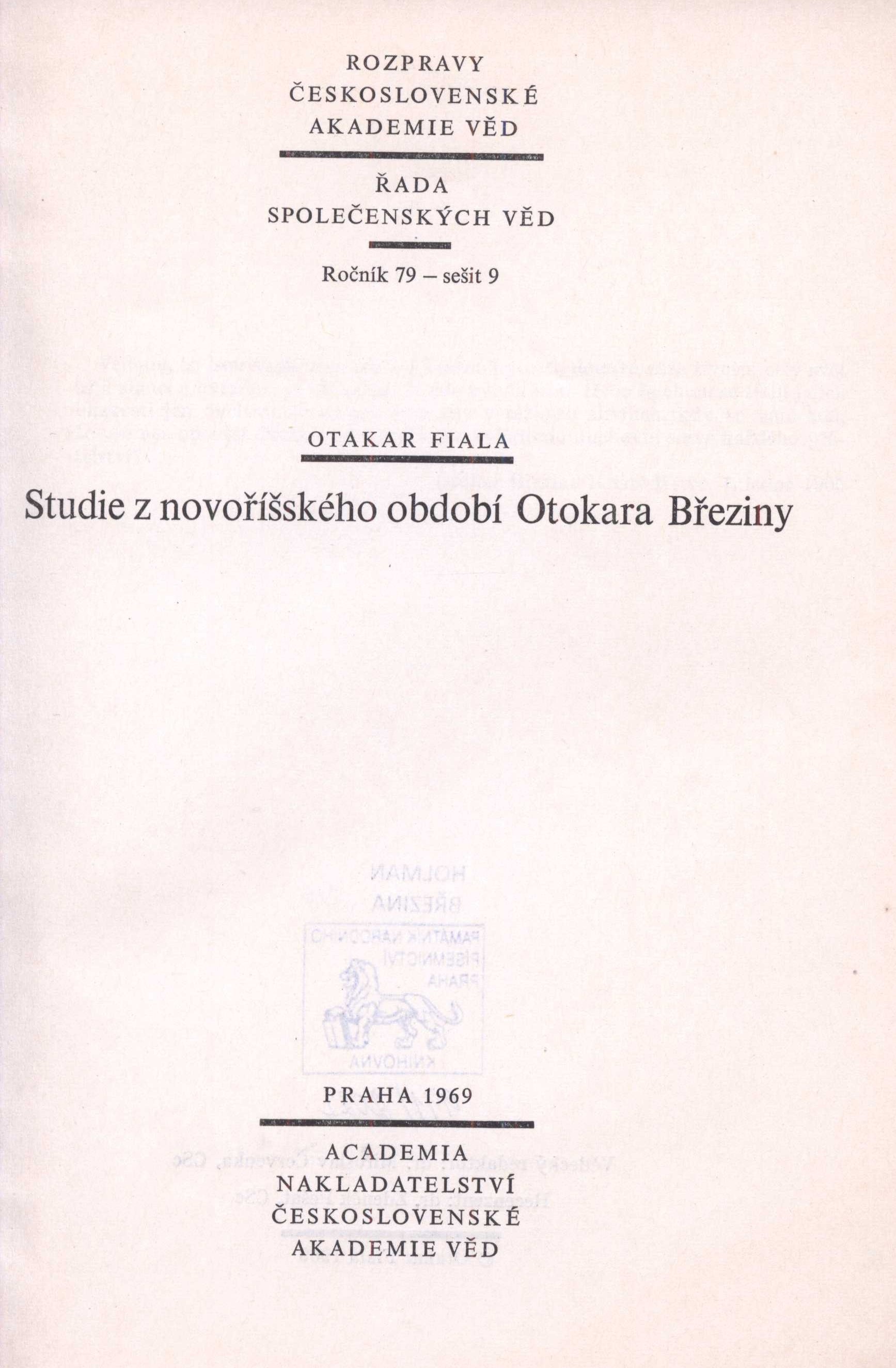 Title information Studie z novoříšského období Otokara Březiny / Otakar Fiala Personal name Fiala, Otakar, 1889-1977 (Author) Další autoři Academia (nakladatelství) (Publisher) Státní tiskárna v Praze (Printer) Publication Praha : Academia, nakladatelství Československé akademie věd, 1969 Manufacture Státní tiskárna, n.p., závod 5 Scope 67 stran, 4 nečíslované strany obrazových příloh : ilustrace, portréty ; 24 cm ISBN (Brožováno) Edition Rozpravy Československé akademie věd. Řada společenských věd ; ročník 79, sešit 9