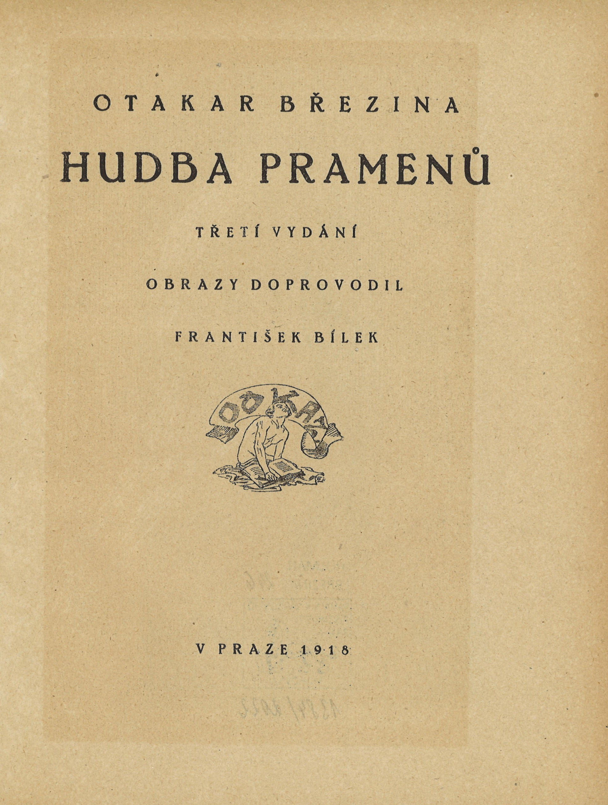 Title information Hudba pramenů / Otakar Březina ; obrazy doprovodil František Bílek Personal name Březina, Otokar, 1868-1929 (Author) (Inscriber) Další autoři Bílek, František, 1872-1941 (Illustrator) Corporation Odkaz (nakladatelství) (Publisher) Lidová knihtiskárna J. Skalák a spol. (Printer) Edition statement Třetí vydání Publication V Praze : nákladem Vydavatelského sdružení Odkaz, 1918 Manufacture Lidová knihtiskárna J. Skalák a spol. Scope 51 stran, 10 nečíslovaných listů obrazových příloh : ilustrace ; 23 cm ISBN (Vázáno) Edition Prosy / Otakar Březina ; svazek I