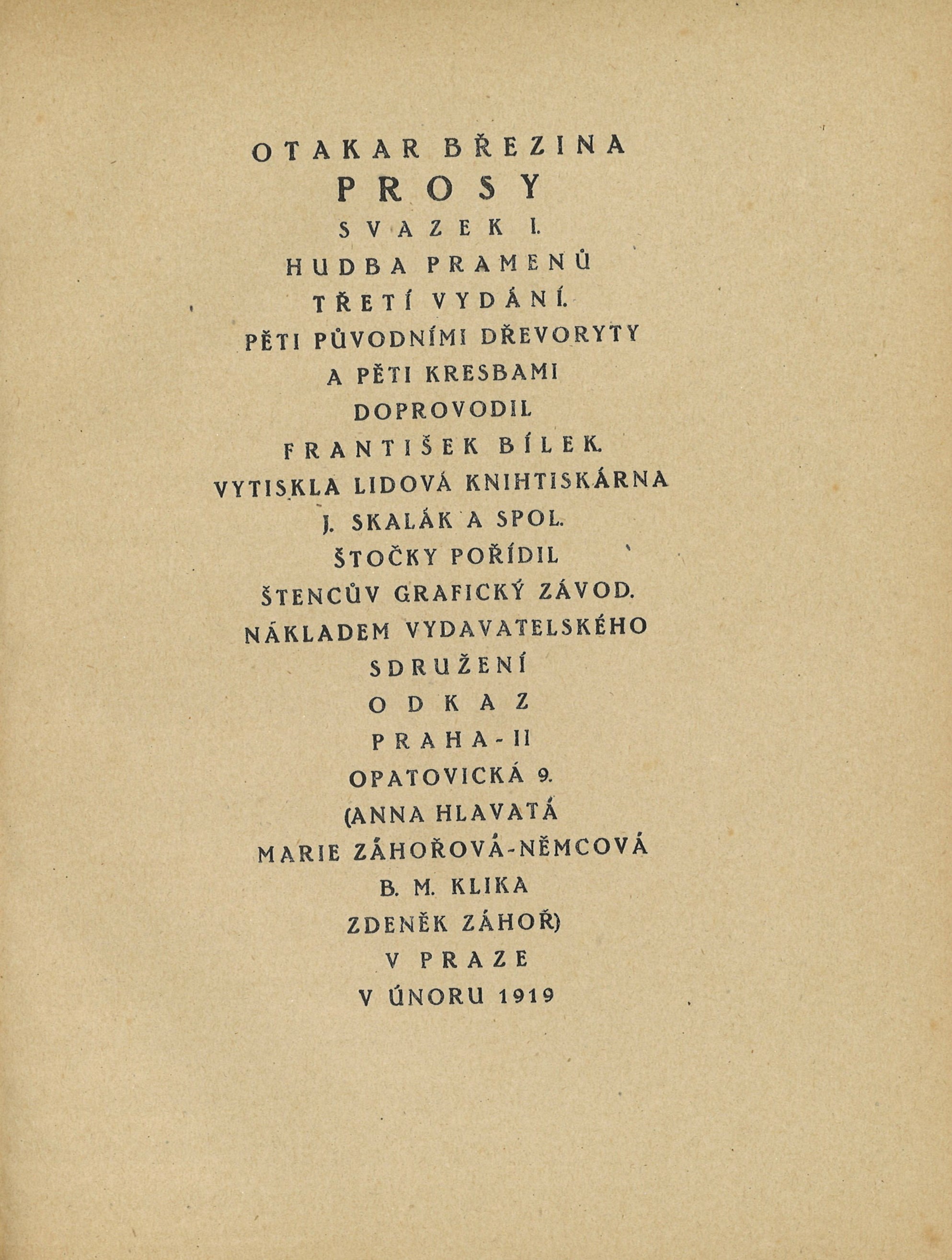 Prosy, Otakar Březina (Vydavatelské sdružení Odkaz)Country Czech Republic Language Czech Note Zdobená obálka. - Frontispis s podobiznou autora. - Reprodukce pěti dřevorytů a pěti kreseb Františka Bílka v obrazových přílohách.