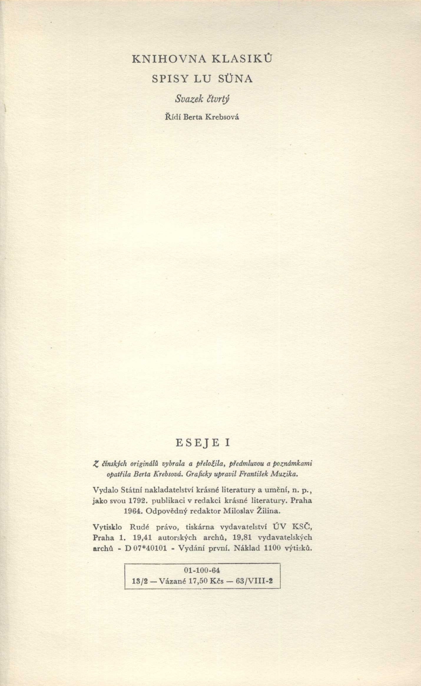 Knihovna klasiků, (SNKLHU) Spisy, Lu Sün, (Státní nakladatelství krásné literatury, hudby a umění)Country Czech Republic Language Czech Language of the original Chinese Ser.statement/add.entry Lu, Xun, 1881-1936. Spisy svazek čtvrtý Note Graficky upravil František Muzika