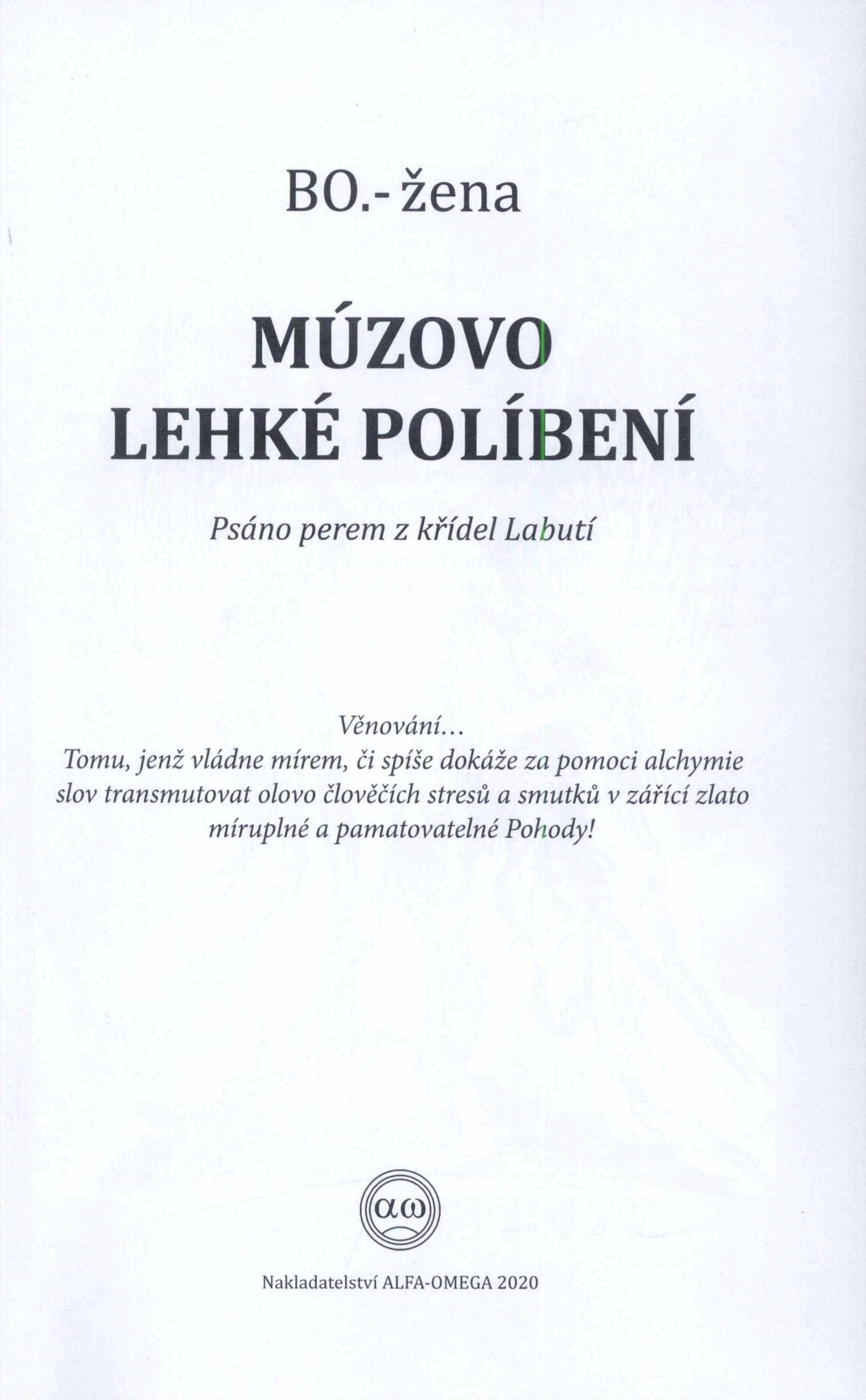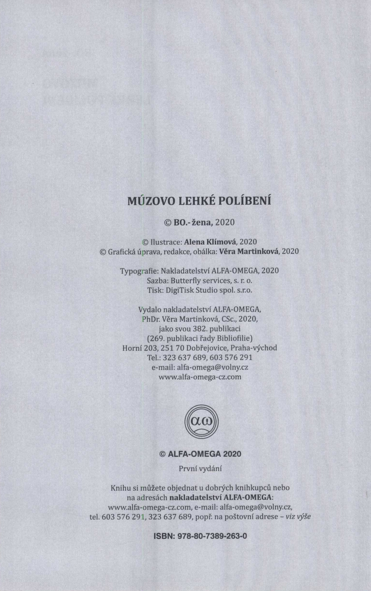Title information Múzovo lehké políbení : psáno perem z křídel Labutí / BO.-žena Author BO-žena, 1941- (Author) (Inscriber) Další autoři Klímová-Brejchová, Alena, 1941- (Illustrator) Martinková, Věra, 1948- (Book designer) (Compositor) Corporation Alfa-Omega (nakladatelství) (Publisher) (Typographer) Butterfly services, s. r. o (firma) (Compositor) Digitisk Studio, s. r. o. (tiskárna) (Printer) (Printer of plates) Další var.názvy Psáno perem z křídel Labutí Edition statement První vydání Publication Dobřejovice : Nakladatelství ALFA-OMEGA, 2020 Manufacture [Praha] : DigiTisk Studio spol. s r.o. Scope 35 stran : ilustrace ; 21 cm ISBN 978-80-7389-263-0 (brožováno) Edition 269. publikace řady Bibliofilie